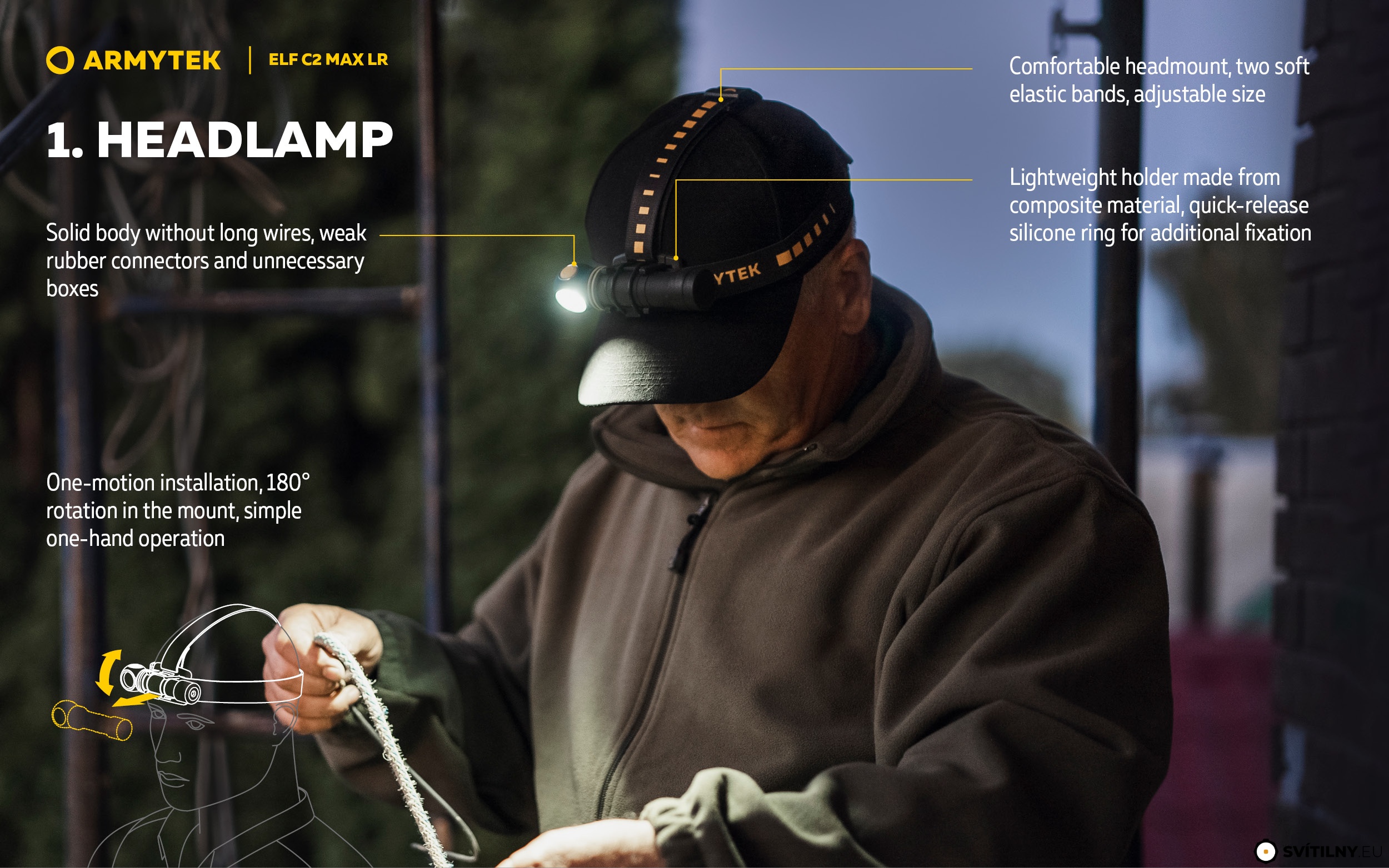 - Magnetická koncovka umožňuje přichytit čelovku na cokoliv železného.