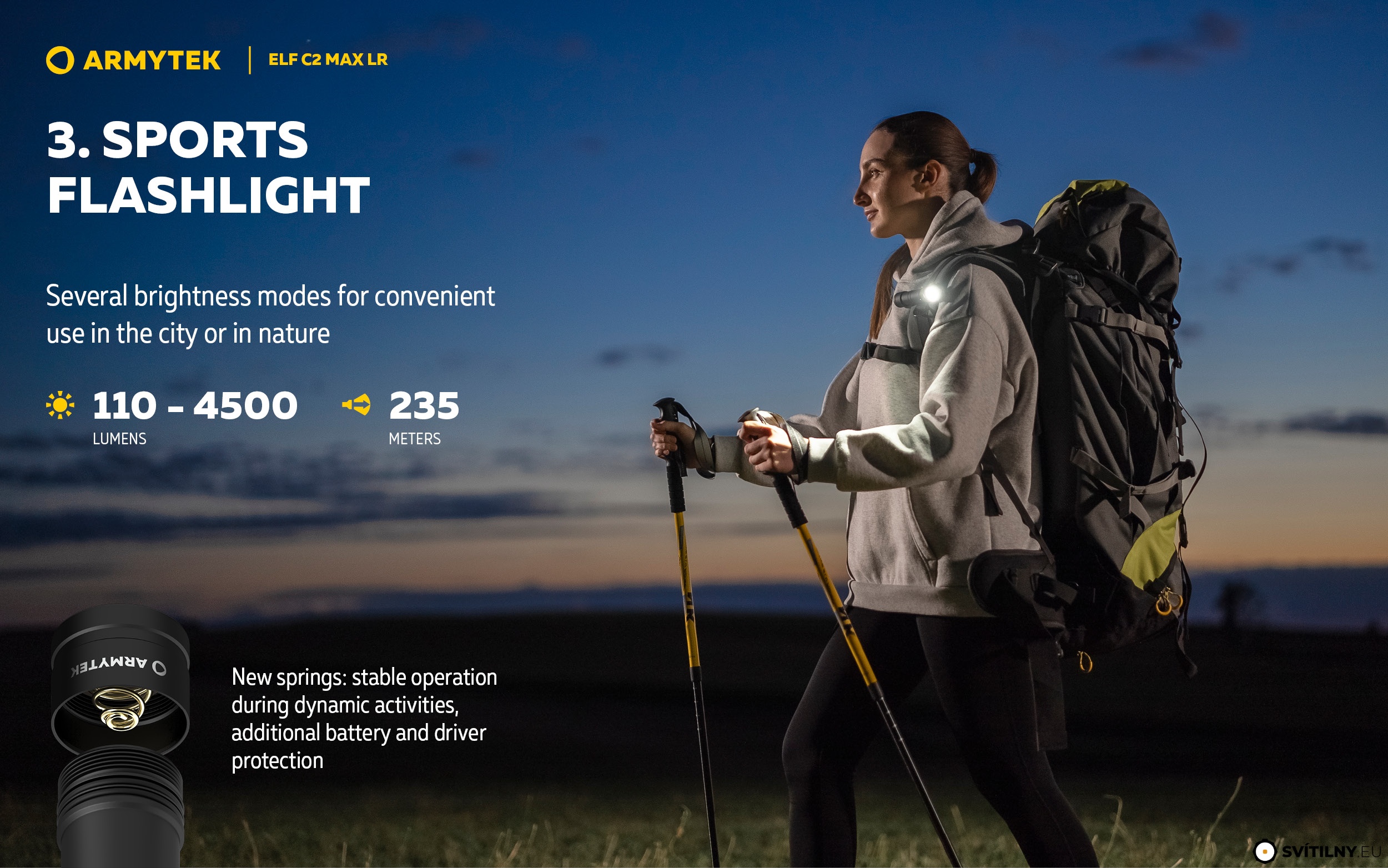 Upozornění na vysokou teplotu: Elektronika aktivně sleduje teplotu. Pokud přesáhne +58 °C, svítilna plynule sníží výkon, aby se ochladila, jakmile teplota klesne, výkon se opět zvýší.