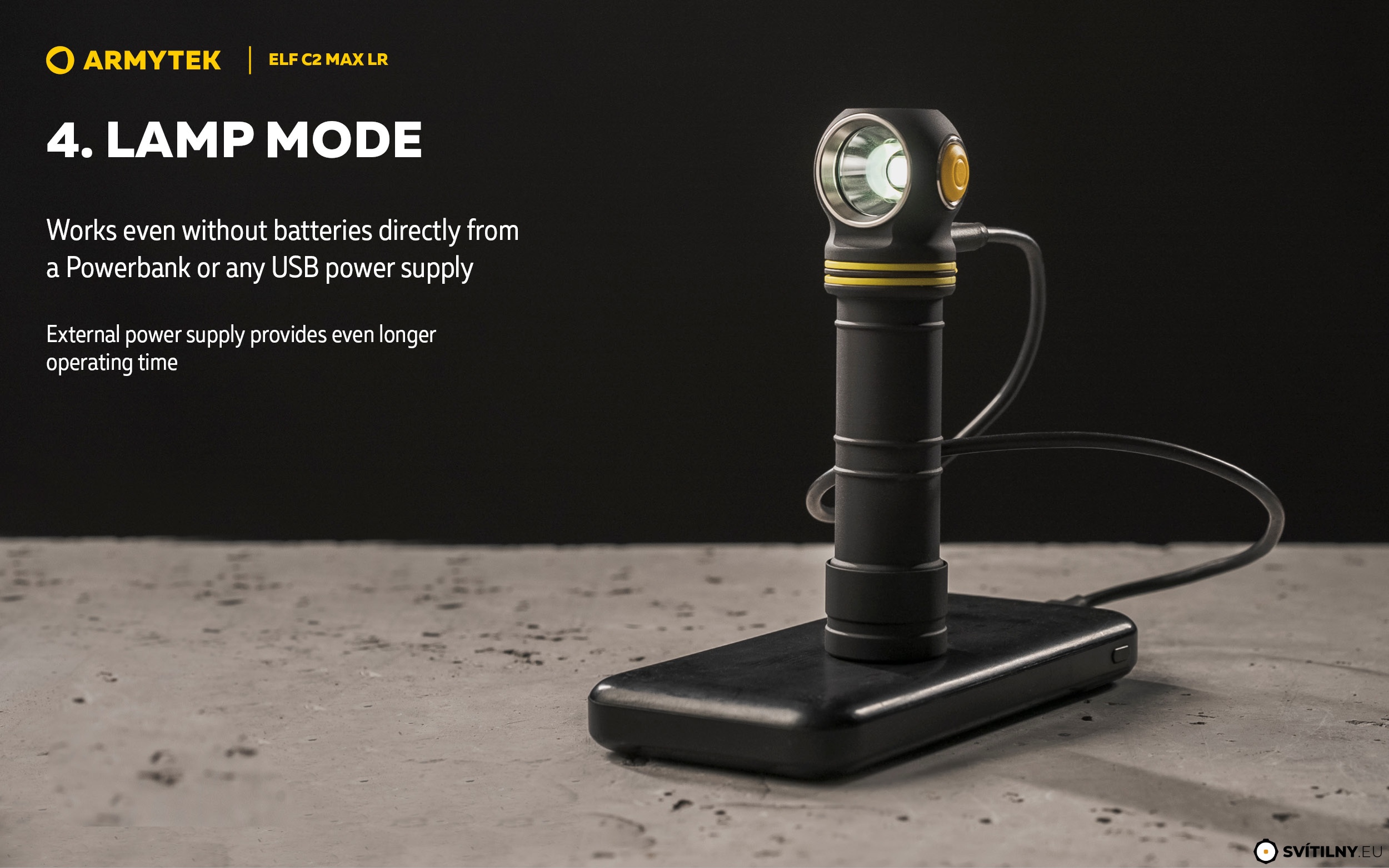 Režim Lampy (Lamp Mode): Velkou výhodou modelu Elf C2 Max LR je schopnost provozu bez baterie. Připojte svítilnu k Powerbance nebo USB zdroji a používejte ji jako stacionární lampu s neomezenou výdrží (dostupné režimy závisí na síle zdroje, pro plný výkon je doporučen zdroj min. 2A).