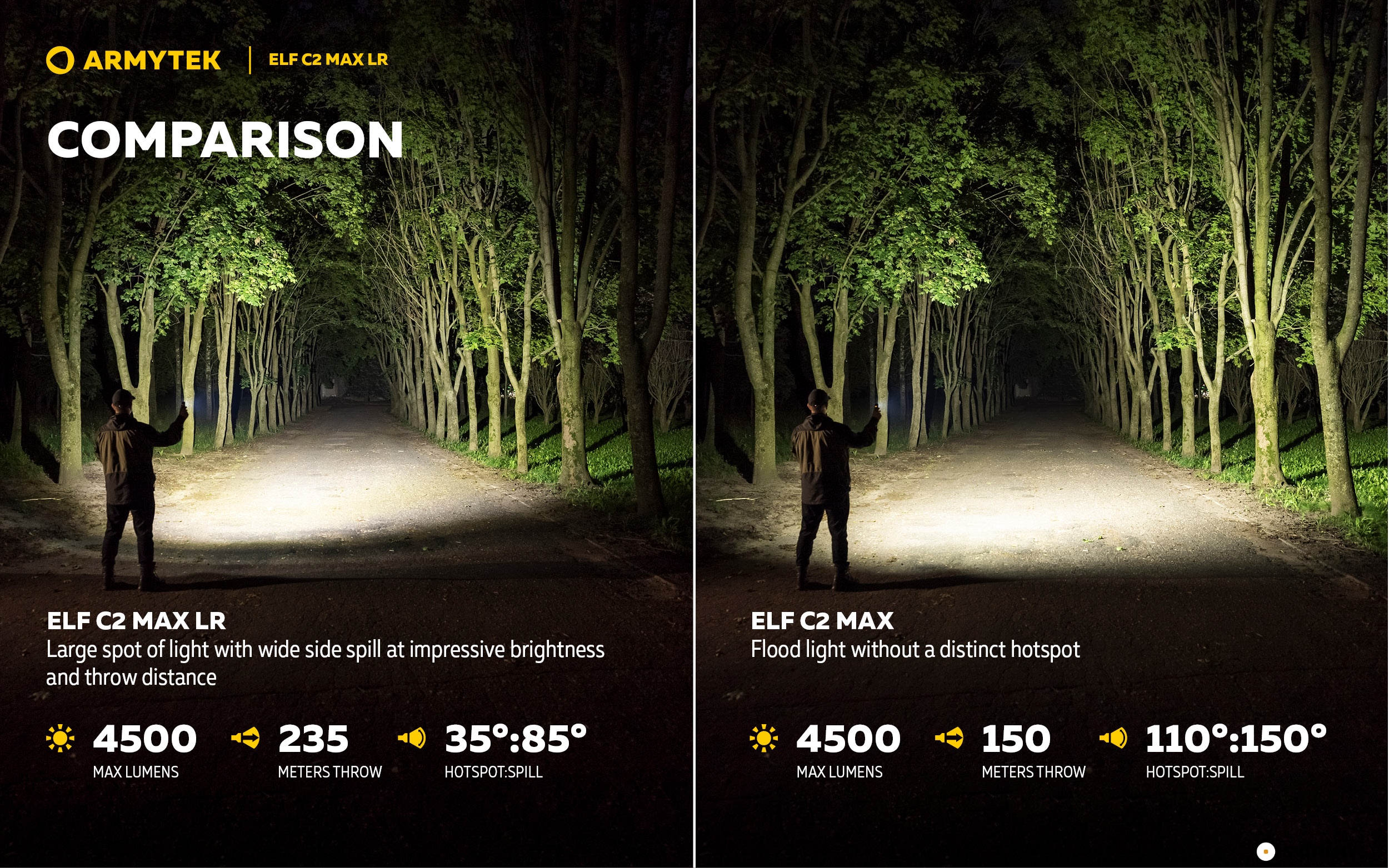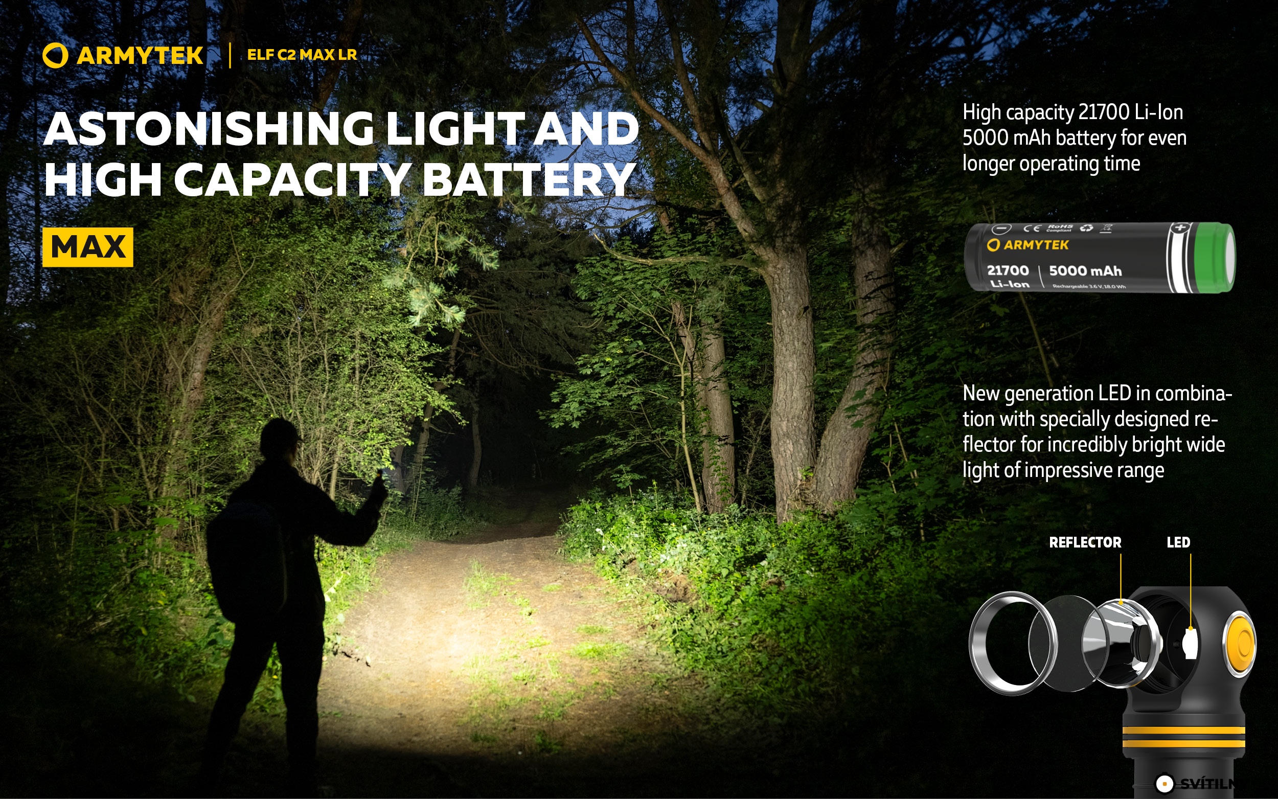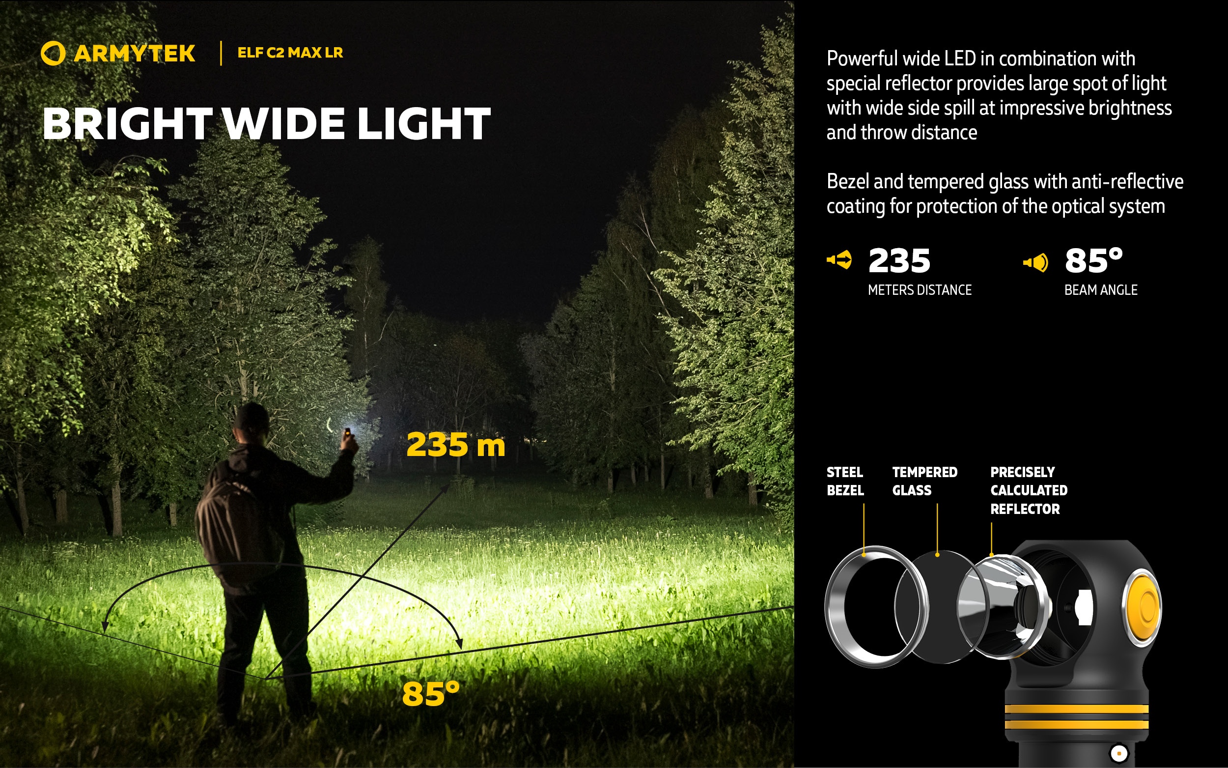 - Speciálně navržený reflektor pro dlouhý dosvit až 235 metrů (35° ohnisko, 85° halo). Ideální kompromis pro osvětlení velkých prostor i detailní nasvícení vzdálených cílů.