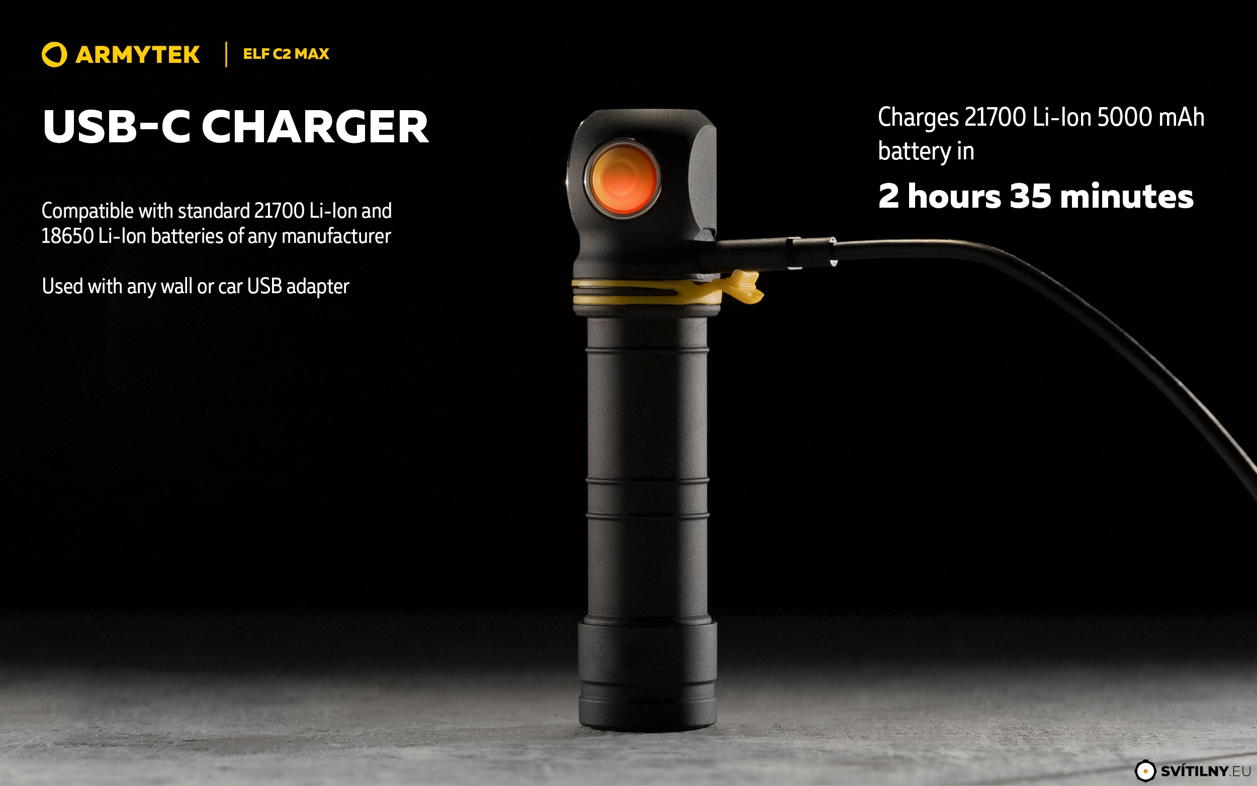 Odklopte gumovou krytku nabíjecího konektoru a zapojte přiložený kabel do svítilny (konektor USB-C), druhý konec kabelu zapojte do počítače, powerbanky nebo USB adaptéru. Během nabíjení svítí boční tlačítko červeně a po plném nabití se rozsvítí zeleně. Nabíjení baterie 21700 trvá díky inteligentnímu algoritmu pouhé 2 hodiny a 35 minut při využití USB zdroje o výkonu 10W (5 V / 2 A) a vyšším.