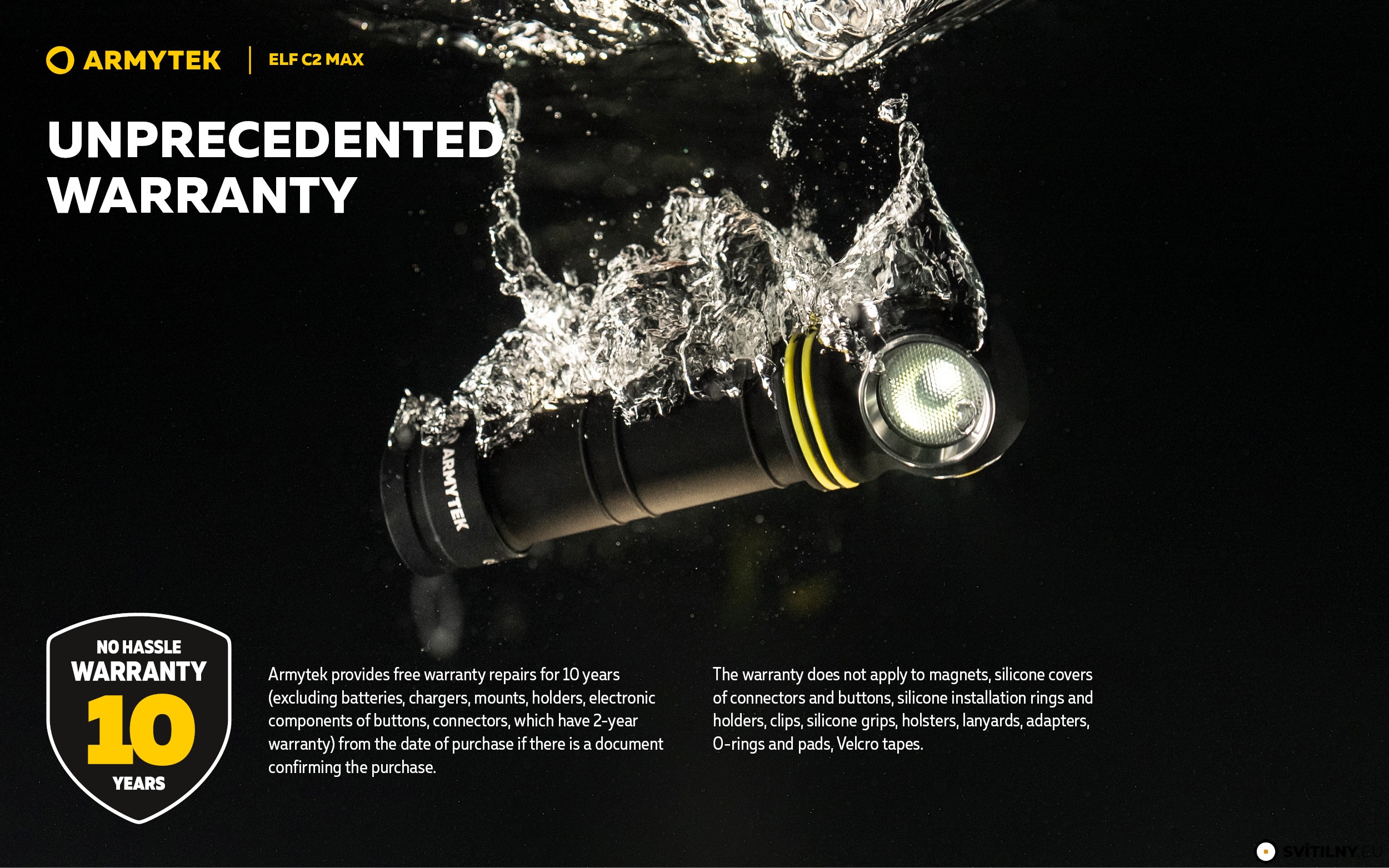 Záruka 10 let na čelovku, 2 roky na akumulátor.