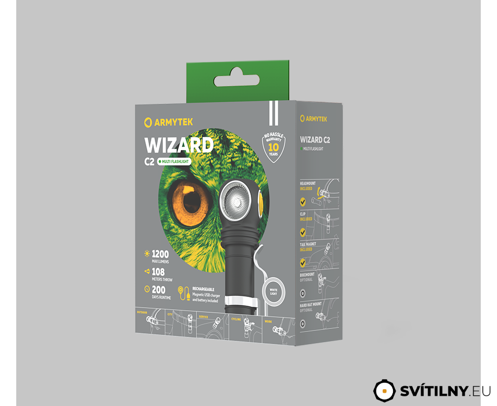 Čelovka Armytek Wizard C2 White nabízí světelný tok až 1200 lumenů. Světelným zdrojem je moderní LED Samsung LH351D, která v kombinaci se speciálně navrženým TIR kolimátorem vytváří mohutný světelný kužel s dosvitem až 108 metrů. Součástí balení je Li-ion akumulátor Armytek 18650 3200 mAh, který se nabíjí přímo v čelovce pomocí USB kabelu s magnetickým konektorem. Celkem svítilna nabízí šest funkcí svícení. Mezi pokročilé funkce patří i upozornění na vybité baterie a ochrana proti přehřátí. Armytek Wizard je špičkovou čelovkou pro běh, turistiku, cyklistiku, horolezectví, geocaching, rybolov a další aktivity.