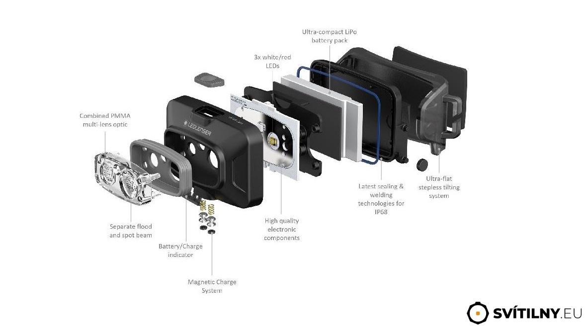 Plynule naklápěcí hlava lampy poskytuje maximální flexibilitu, zatímco štíhlý čelní pásek lze snadno přizpůsobit individuálním potřebám. Interní akumulátor s kapacitou 1000 mAh lze jednoduše nabíjet pomocí magnetického nabíjecího kabelu, který je součástí balení. Praktickou součástí svítilny je také indikátor stavu baterie.