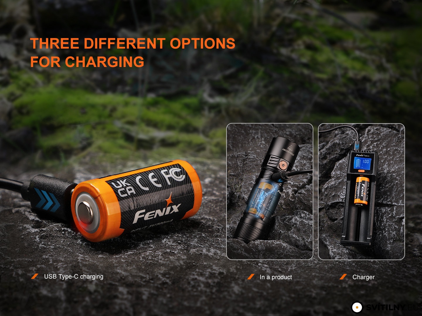 Hlavní výhodou je univerzálnost nabíjení. Baterii můžete nabít zapojením kabelu přímo do jejího USB-C portu (např. nabíječkou od mobilu či z počítače), v klasické externí nabíječce, nebo přímo v nabíjecích svítilnách. Je ideálním řešením zvláště pro modely, které nemají vlastní nabíjecí port, například Fenix GL06, Fenix GL07 či Fenix GL22. Skvěle poslouží i jako náhradní akumulátor pro svítilny Fenix E18R V2.0, Fenix HM50R V2.0, Fenix HM51R V3.0, Fenix PD25R a další. Díky moderní Li-ion technologii netrpí paměťovým efektem a má minimální samovybíjení, takže je vždy připravena k použití.