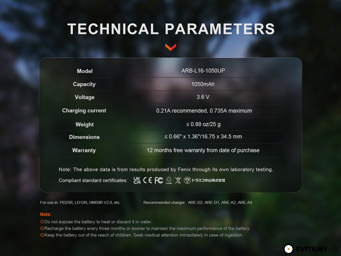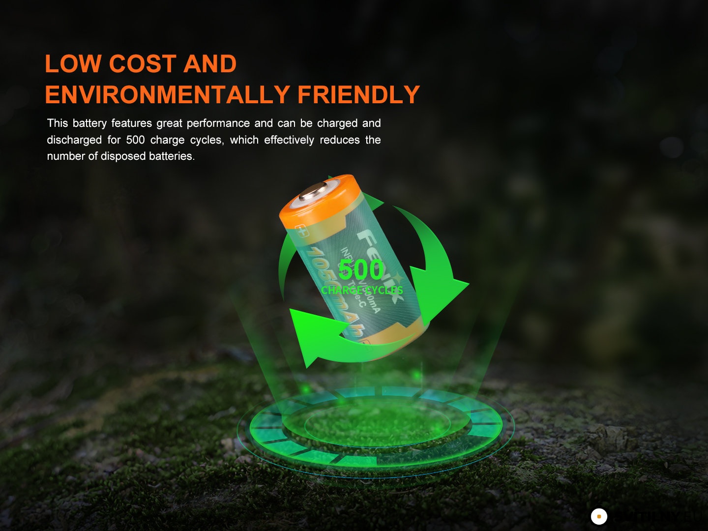 Velikostně odpovídá standardu RCR123A a slouží jako dobíjecí alternativa k jednorázovým CR123A bateriím. Před nákupem si však ověřte kompatibilitu: tento akumulátor má vyšší nominální napětí (3,6 V) oproti jednorázovým bateriím (3 V).