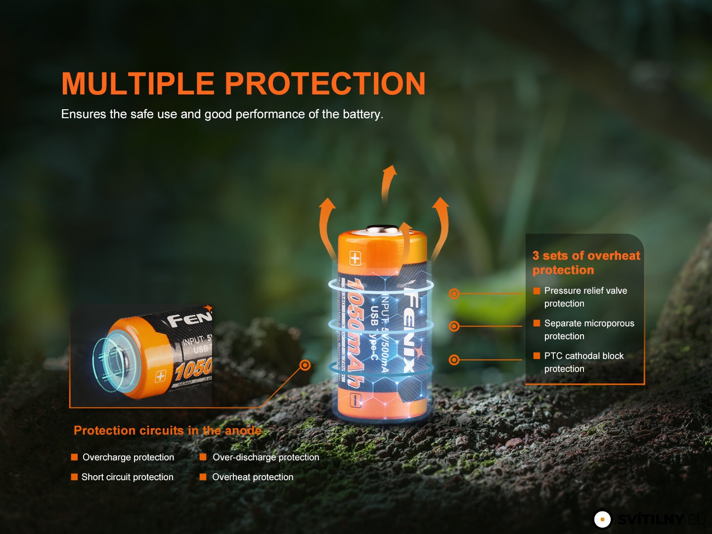 Fenix ARB-L16-1050UP patří k nejbezpečnějším Li-ion akumulátorům na trhu díky dvojstupňové ochraně:
