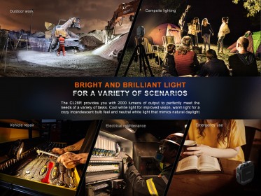 Fenix CL28R je multifunkční nabíjecí lucerna s integrovanou powerbankou. Navíc skvěle funguje i jako nabíjecí pracovní světlo, světlo pro fotografy i jako světlo do domácnosti a do stanu či auta. Vysoce jasná COB dioda poskytuje světelný tok až 2000 lumenů (ANSI), jehož intenzitu lze plynule regulovat otočným ovladačem. Plynulou regulaci má také nastavení barevné teploty světla, kterou lze měnit v rozsahu 2700 - 6000 K. CL28R je napájena zabudovaným Li-ion akumulátorem o celkové kapacitě 10000 mAh, který se nabíjí přímo v lucerně pomocí USB-C konektoru. K dispozici jsou také dva vybíjecí USB-C a USB-A porty, takže světlo můžete použít jako powerbanku s podporou rychlonabíjecích protokolů PD3.0/PD2.0, QC3.0/QC2.0 s výkonem 18W. Svítidlo kromě plynule regulovatelného bílého světla nabízí také dva režimy světla červeného - stálý světelný tok 9 lumenů a blikačku o stejném výkonu 9 lumenů.