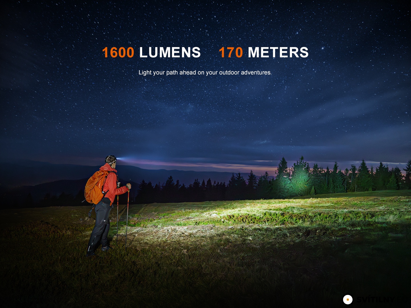 - Dálkový reflektor: 1600 lumenů (3,25 hodiny) -> 600 lumenů (5 hodin) -> 130 lumenů (25 hodin) -> 30 lumenů (74,5 hodiny).