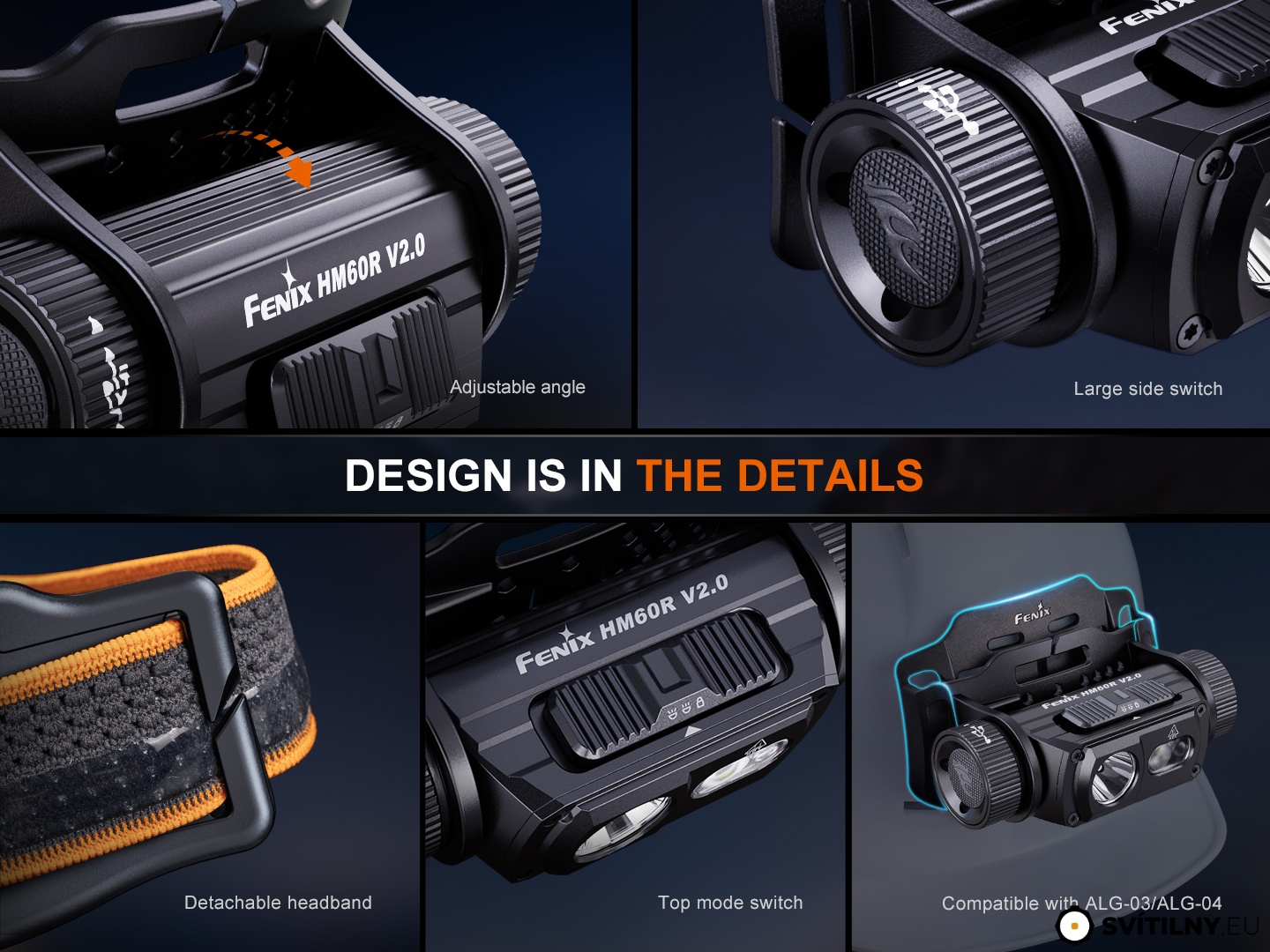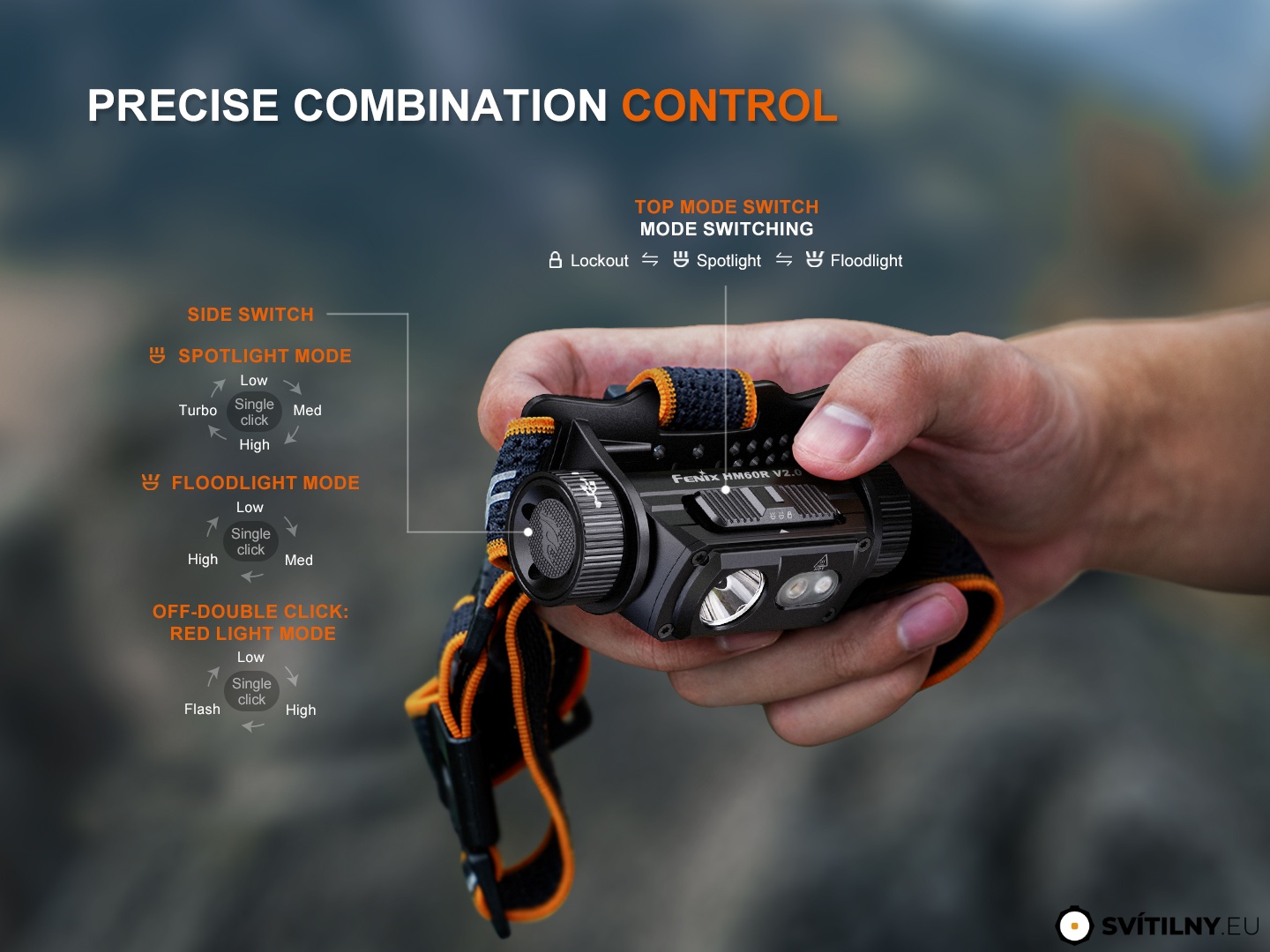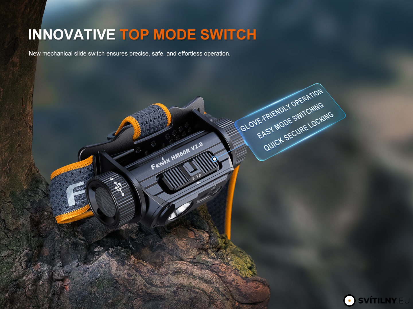 Fenix HM60R V2.0 je vysoce výkonná nabíjecí čelovka, která v hlavním reflektoru nabízí světelný tok až 1600 lumenů s dosvitem 170 metrů. Druhý reflektor s výkonem až 350 lumenů má světelnou stopu velmi širokou a plynulou s neutrálním odstínem světla s vysokým indexem kvality podání barev CRI >90 (Color Rendering Index). Mezi reflektory se přepíná inovativním posuvným voličem na horní straně čelovky s možností jejího uzamknutí. Čelovka disponuje také červeným světlem s výkonem až 20 lumenů. Součástí balení je i nabíjecí Li-ion akumulátor typu 18650 s kapacitou 4000 mAh, který se nabíjí přímo v čelovce přes USB-C konektor. Vzhledem k výbavě je vhodná pro profesionální použití, různorodé sportovní aktivity (turistika, kempování, běh, cyklistika, lyžování...), do podzemí, pro rybáře a další použití. Zaručeně vám skvěle poslouží v každé situaci! Celokovová konstrukce zajišťuje vysokou odolnost, optimální chlazení a zároveň je plně vodotěsná dle standardu IP68 až do hloubky 2 metry pod vodou.