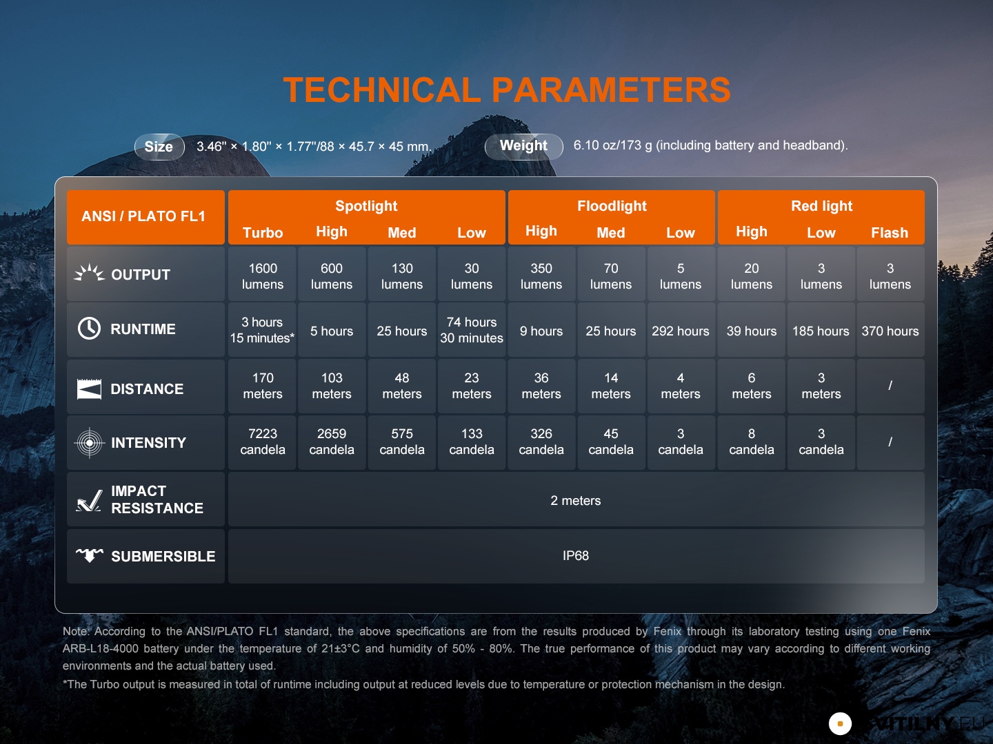 Všechny parametry svítilny (světelný tok, doba provozu na baterie, vodotěsnost, dosvit a nárazuvzdornost) jsou změřeny v souladu s normou ANSI/NEMA FL 1-2009.