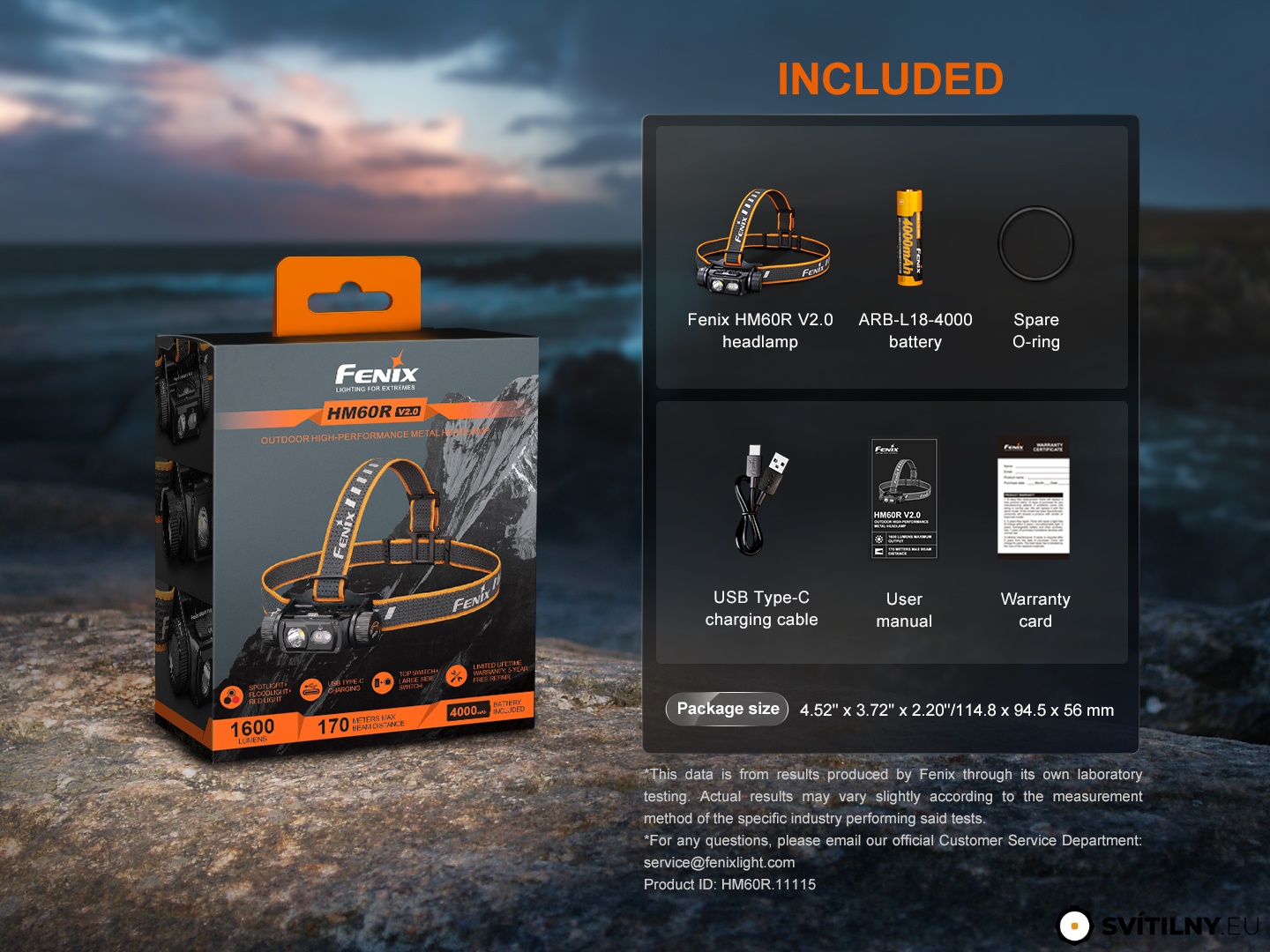 - Součástí balení je čelovka, akumulátor Fenix 18650 4000 mAh, USB-C kabel, popruhy na hlavu a náhradní o-kroužek.