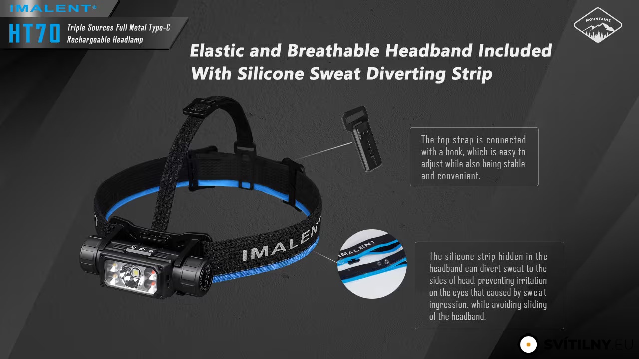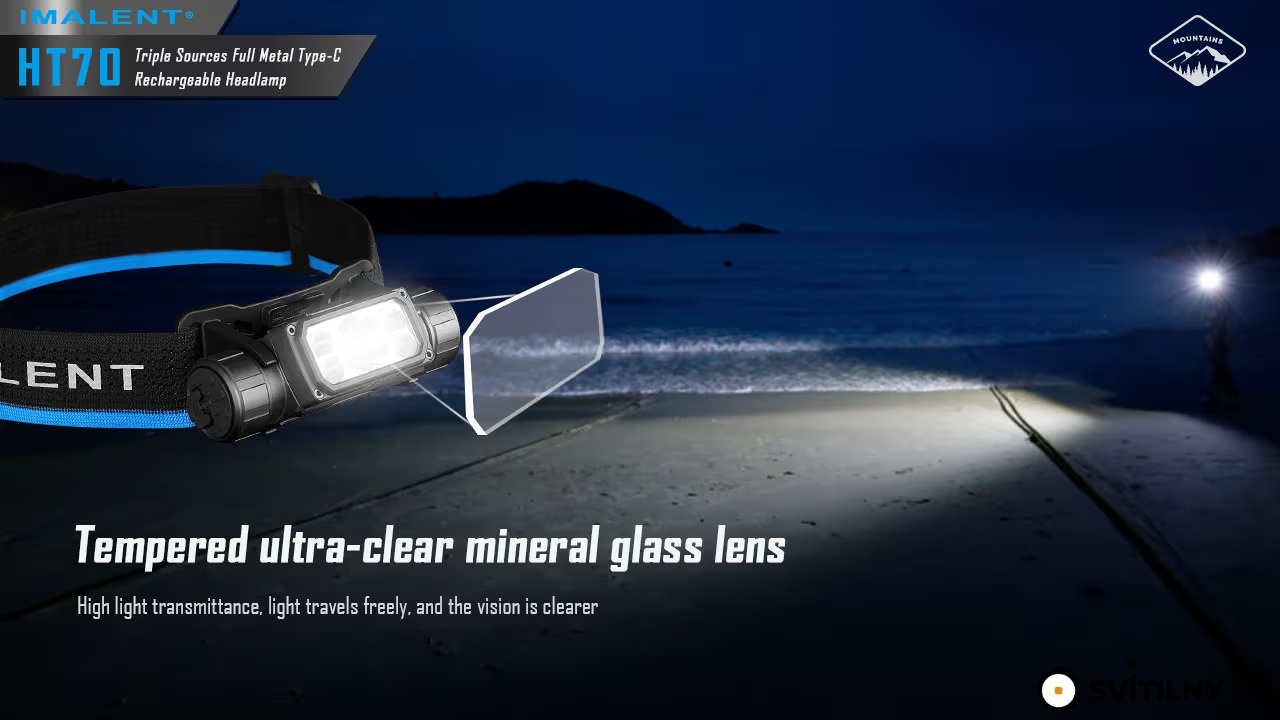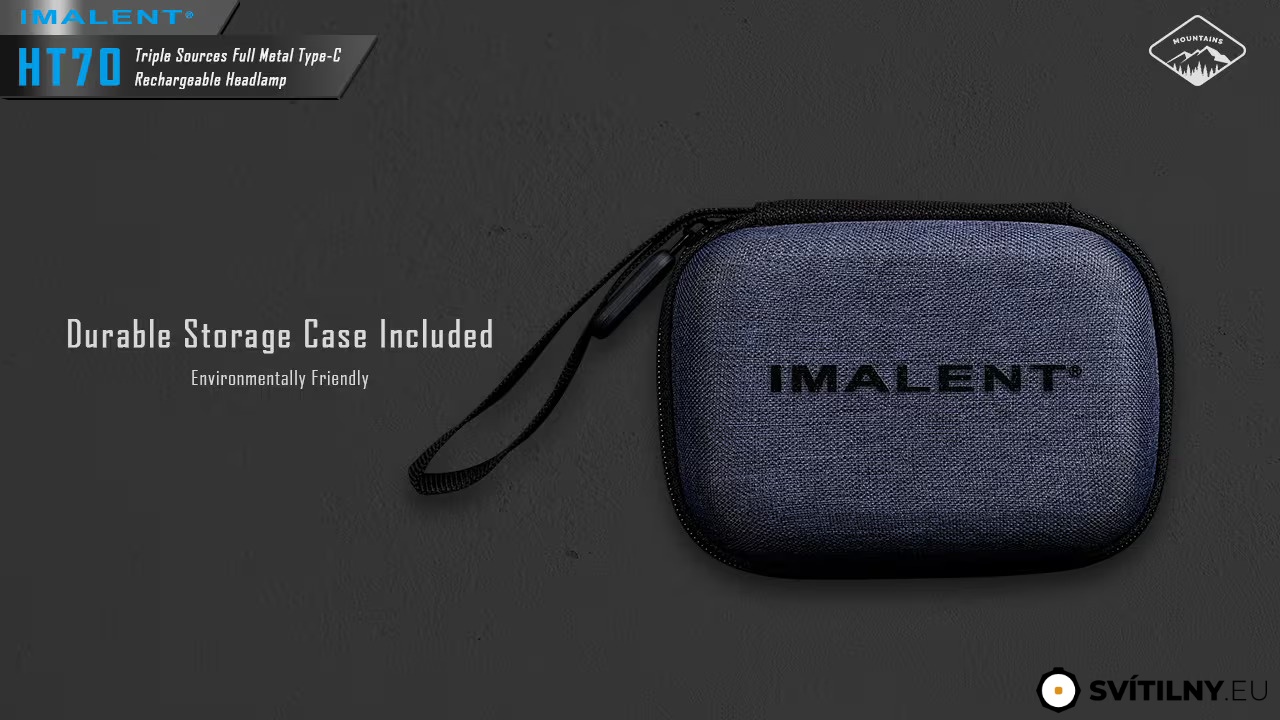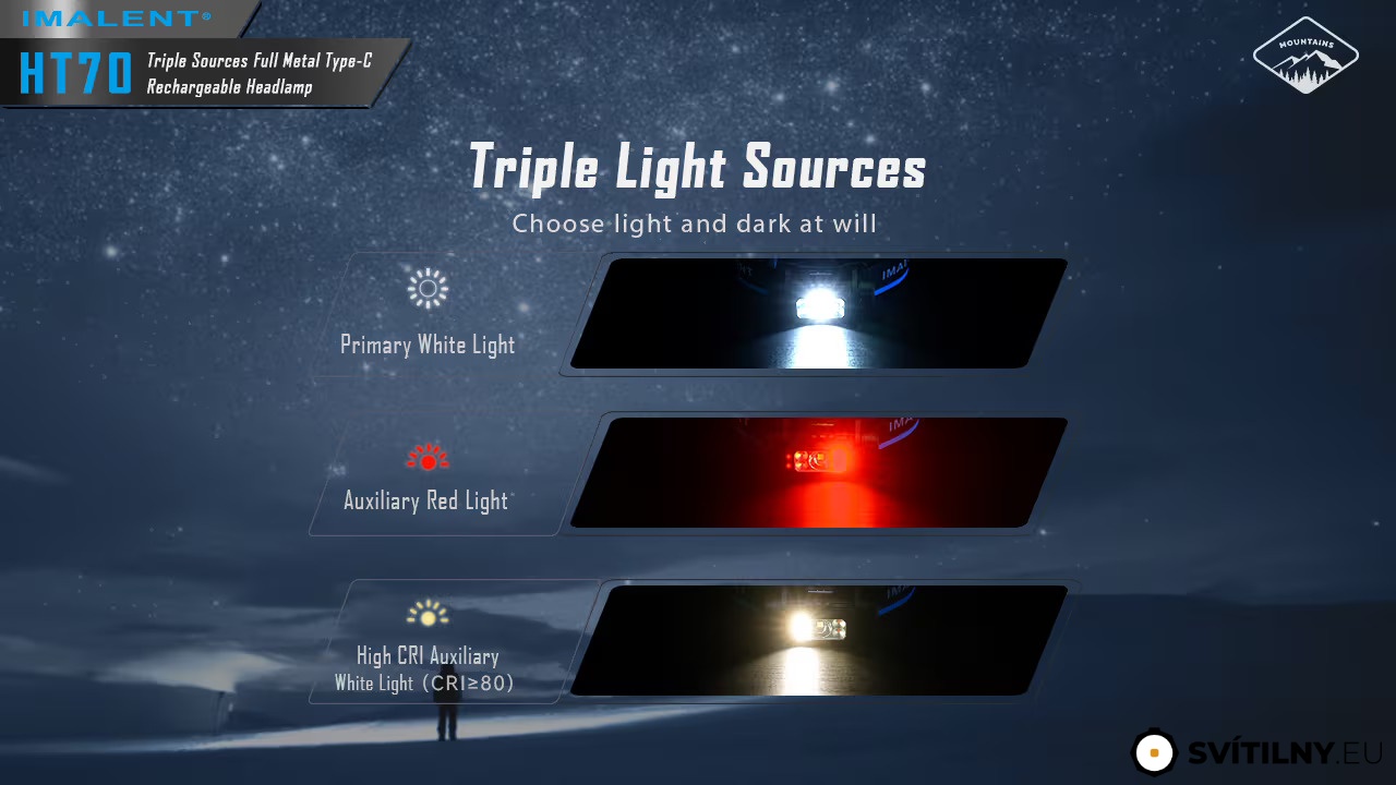 Špičková nabíjecí čelovka Imalent HT70 byla navržena jako kvalitní zdroj světla s vysokou odolností v outdoorových i průmyslových podmínkách. V hlavním dálkovém reflektoru je osazena extrémně výkonná LED Cree XHP50.3 HI, jež dosvítí na vzdálenost až 349 metrů při maximálním světelném toku 3500 lumenů. Dálkové světlo najde využití zejména při různých pátracích, ostrahových a kontrolních činnostech. Pro ostatní případy lze přepnout na dvojici doplňkových LED Cree s širokým kuželem světla pro osvětlení blízkého okolí. Mají teplý odstín (~3500 K) a nadprůměrné CRI (>80 Ra), ve výsledku tak poskytují příjemnější světlo, které tolik nenamáhá oči. Nakonec je zde ještě dvojice červených LED s maximálním výkonem 80 lumenů, které lze použít pro zachování noční vize nebo jako blikající signalizaci.