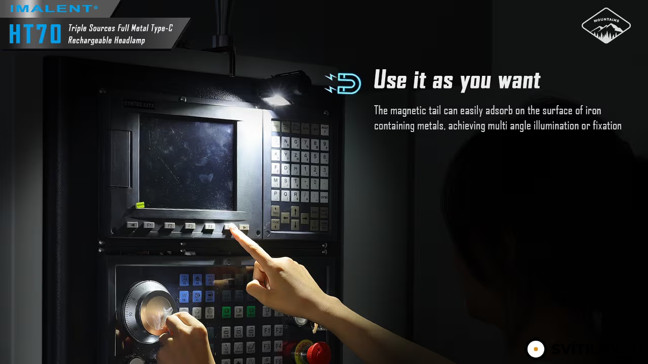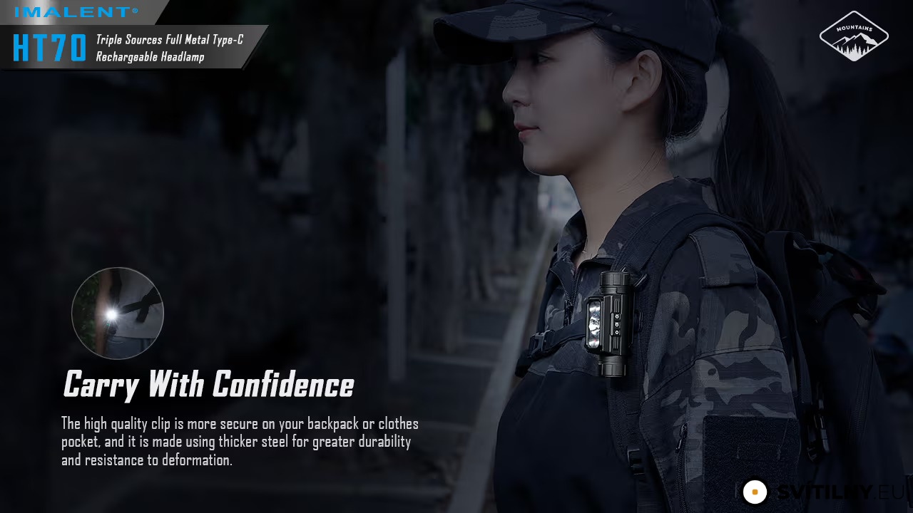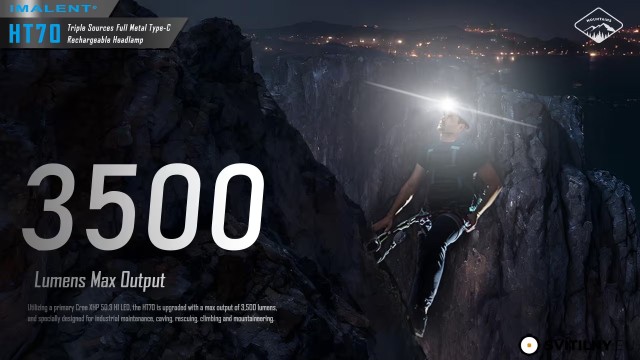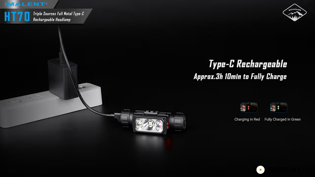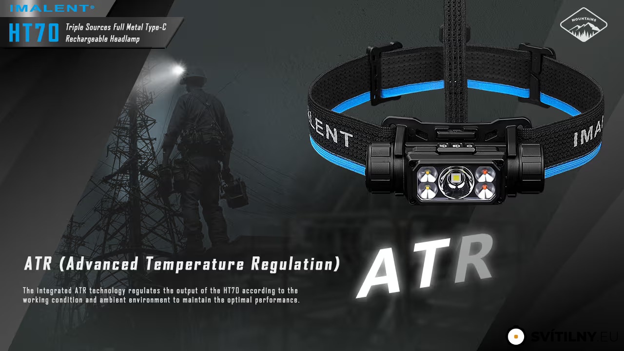 Špičková nabíjecí čelovka Imalent HT70 byla navržena jako kvalitní zdroj světla s vysokou odolností v outdoorových i průmyslových podmínkách. V hlavním dálkovém reflektoru je osazena extrémně výkonná LED Cree XHP50.3 HI, jež dosvítí na vzdálenost až 349 metrů při maximálním světelném toku 3500 lumenů. Dálkové světlo najde využití zejména při různých pátracích, ostrahových a kontrolních činnostech. Pro ostatní případy lze přepnout na dvojici doplňkových LED Cree s širokým kuželem světla pro osvětlení blízkého okolí. Mají teplý odstín (~3500 K) a nadprůměrné CRI (>80 Ra), ve výsledku tak poskytují příjemnější světlo, které tolik nenamáhá oči. Nakonec je zde ještě dvojice červených LED s maximálním výkonem 80 lumenů, které lze použít pro zachování noční vize nebo jako blikající signalizaci.