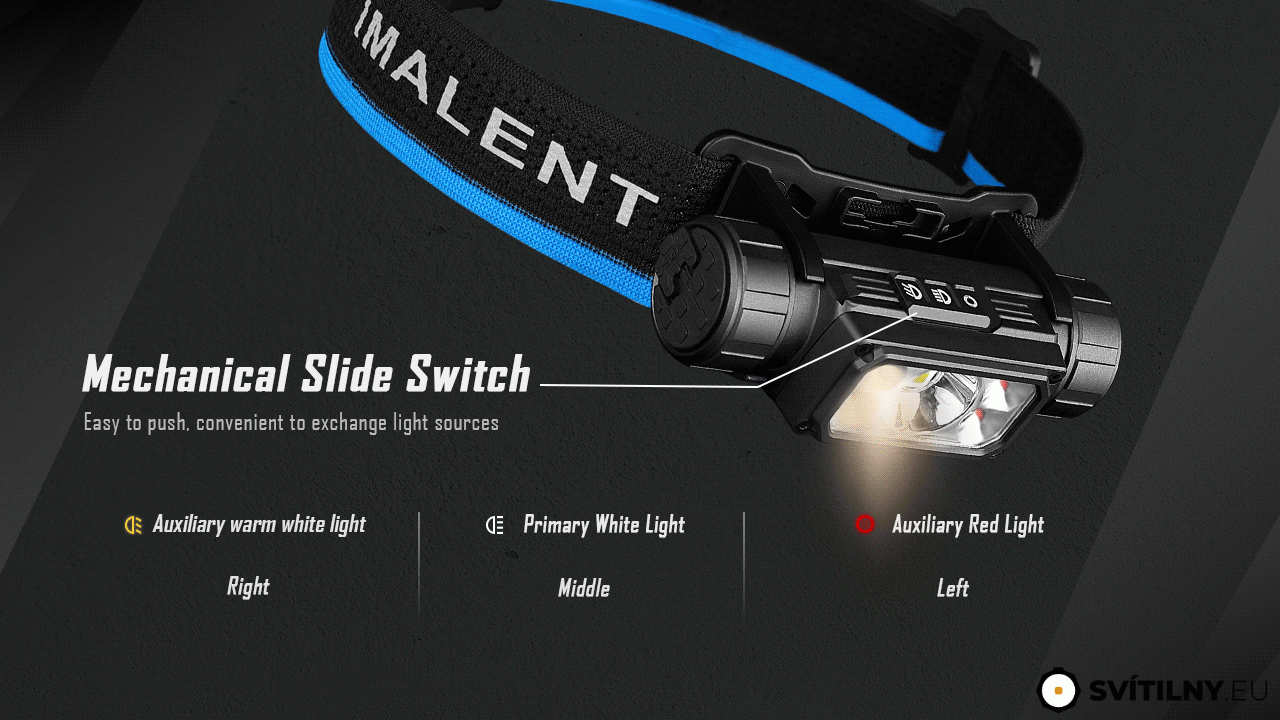 Mezi třemi typy světla (hlavní reflektor, teplé světlo a červené světlo) se přepíná posuvným voličem na vrchní straně svítilny.