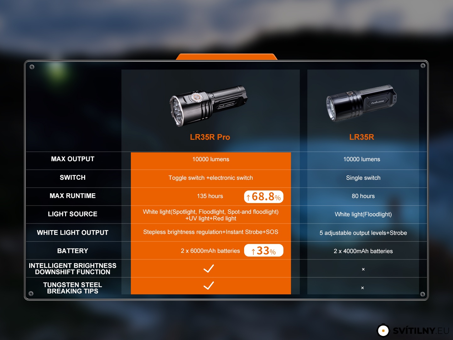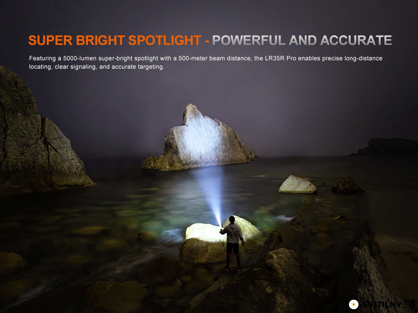 Fenix LR35R PRO je extrémně silná a všestranná svítilna navržená pro výjimečný výkon v každé situaci. Poskytuje oslnivý světelný tok až 10 000 lumenů a maximální dosvit 500 metrů. Pro maximální univerzálnost v sobě kombinuje několik specializovaných světelných zdrojů: dálkový reflektor o síle 5000 lumenů, široký reflektor s výkonem 8000 lumenů, červené světlo (260 lm) a výkonné UV světlo 3,7 W.