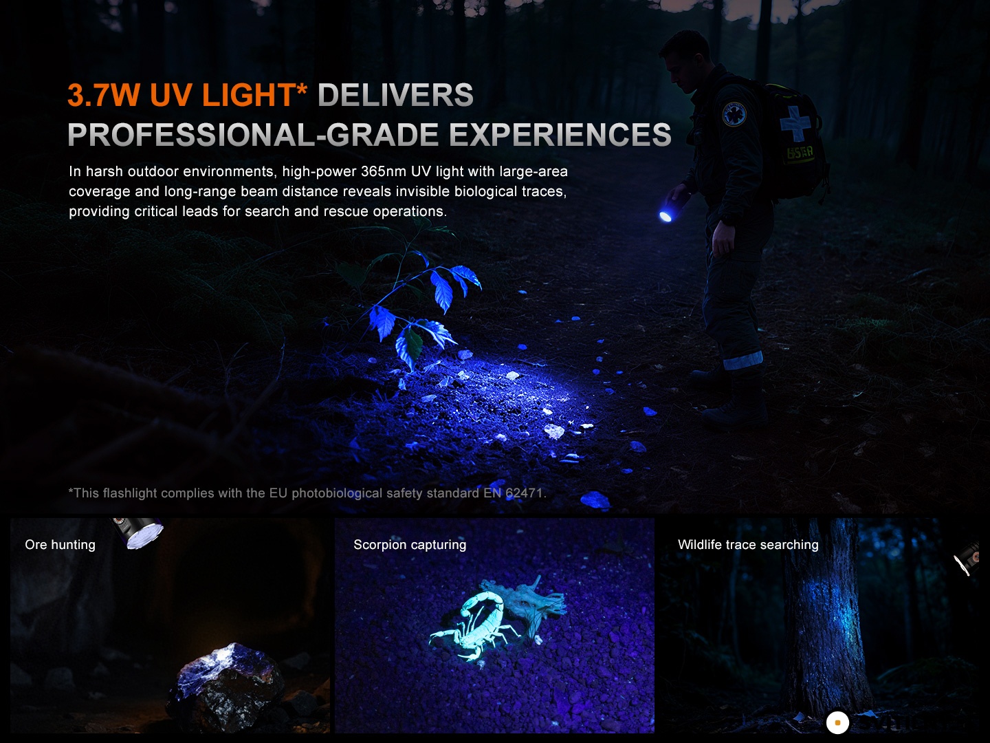 Bezpečnost provozu zajišťuje inteligentní ochrana proti přehřátí, která automaticky snižuje výkon při vysoké teplotě. Úderný ráfek z nerezové oceli je osazen hroty z wolframové oceli, které umožňují bleskové rozbití skla v nouzových situacích. Samozřejmostí je funkce uzamčení proti nechtěnému zapnutí. Svítilna je konstruována tak, aby vydržela i ty nejnáročnější podmínky – je plně prachotěsná a vodotěsná dle standardu IP68 a nárazuvzdorná pádům z výšky 1 metru. Je tak ideálním společníkem pro pátrací a záchranné operace, outdoorová dobrodružství a profesionální nasazení.