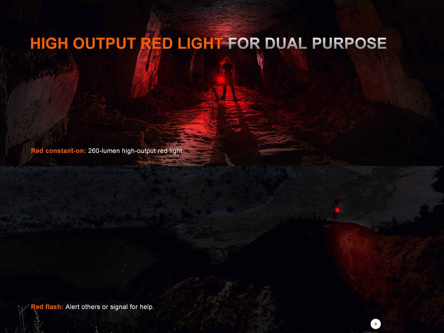 - Plynule nastavitelné červené světlo v rozsahu 260 lumenů (6,8 hodiny) - 10 lumenů (290 hodin) a s funkcí blikačky v rozsahu 260 lumenů - 10 lumenů.
