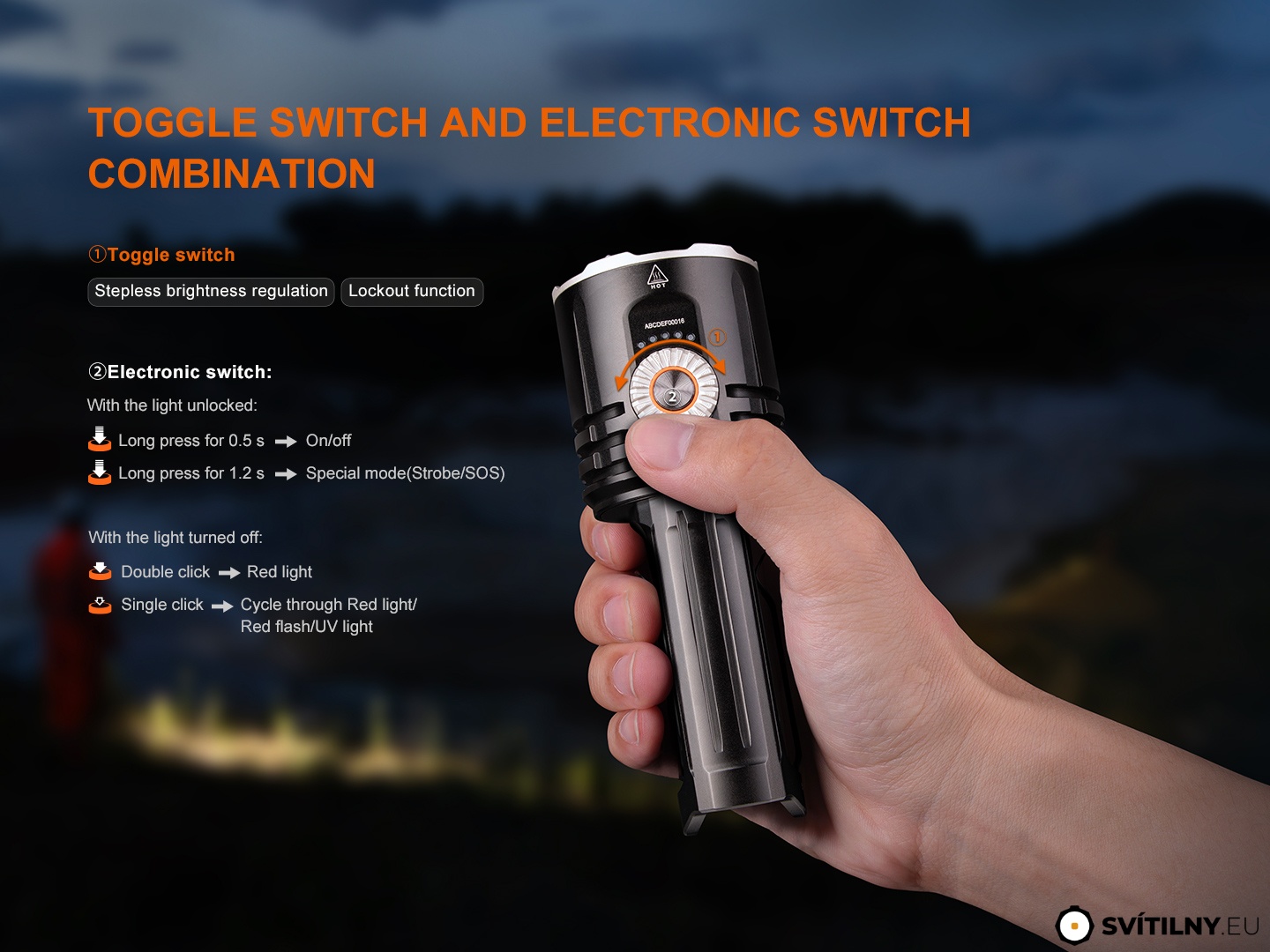 Přepínání režimů - Při zapnuté svítilně lze stiskem elektronického spínače přepínat mezi režimy bílého světla Dálkový reflektor → Široký reflektor → kombinace Dálkový + Široký reflektor. Při zapnutém barevném světle se stiskem spínače přepíná mezi režimy Červené světlo → Červené blikání → UV světlo. Při odemknuté svítilně stiskněte a podržte elektronický spínač po dobu 1,2 s pro přechod do zábleskových režimů. Jednotlivými stisky spínače pak lze přepínat mezi stroboskopem a SOS. Opětovným podržením elektronického spínače se přepne zpět do posledního stálého režimu svícení.