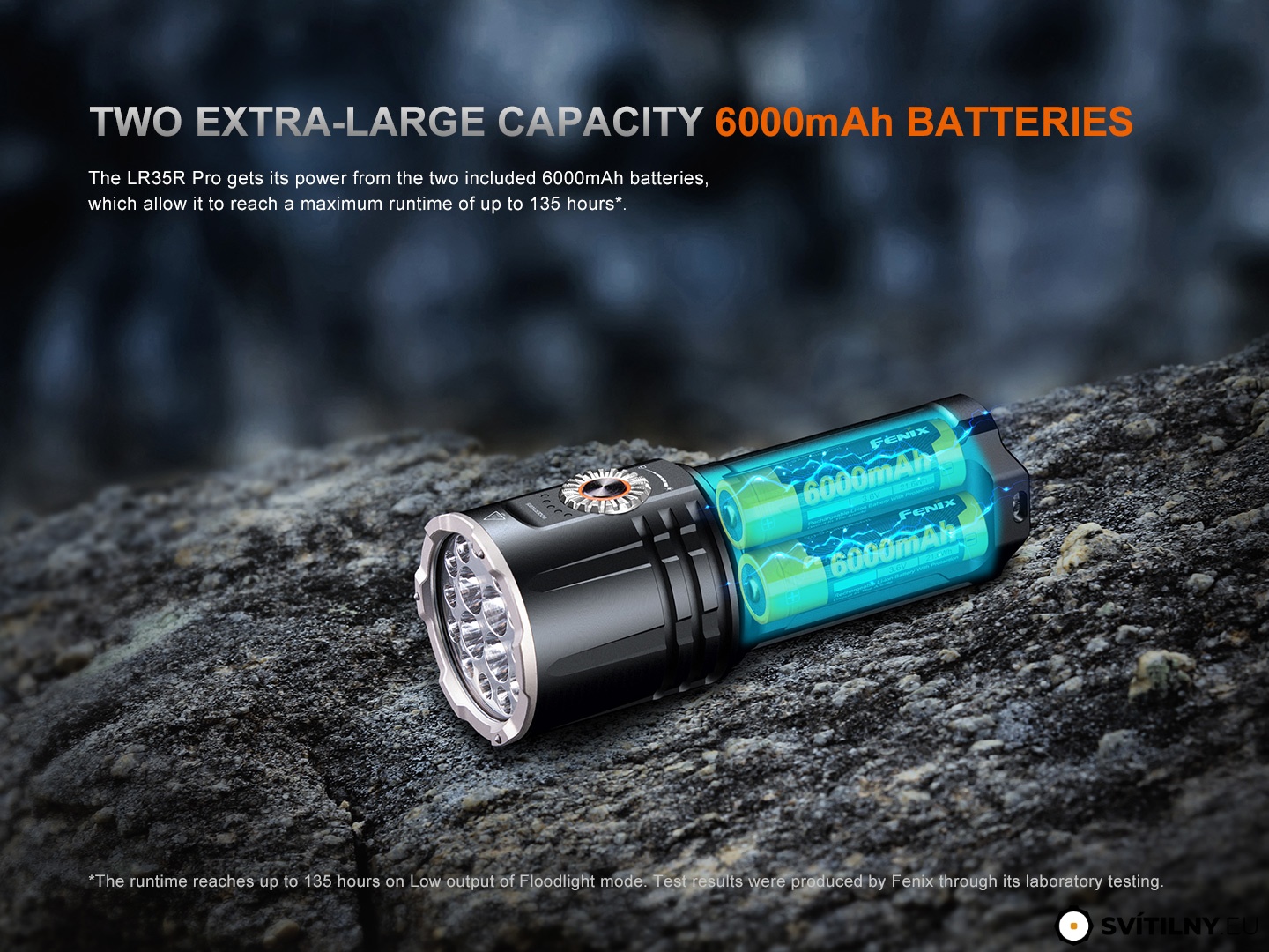 - Svítilna je napájena dvěma Li-ion akumulátory 21700 s kapacitou 6000 mAh (Fenix ARB-L21-6000), které jsou součástí balení.