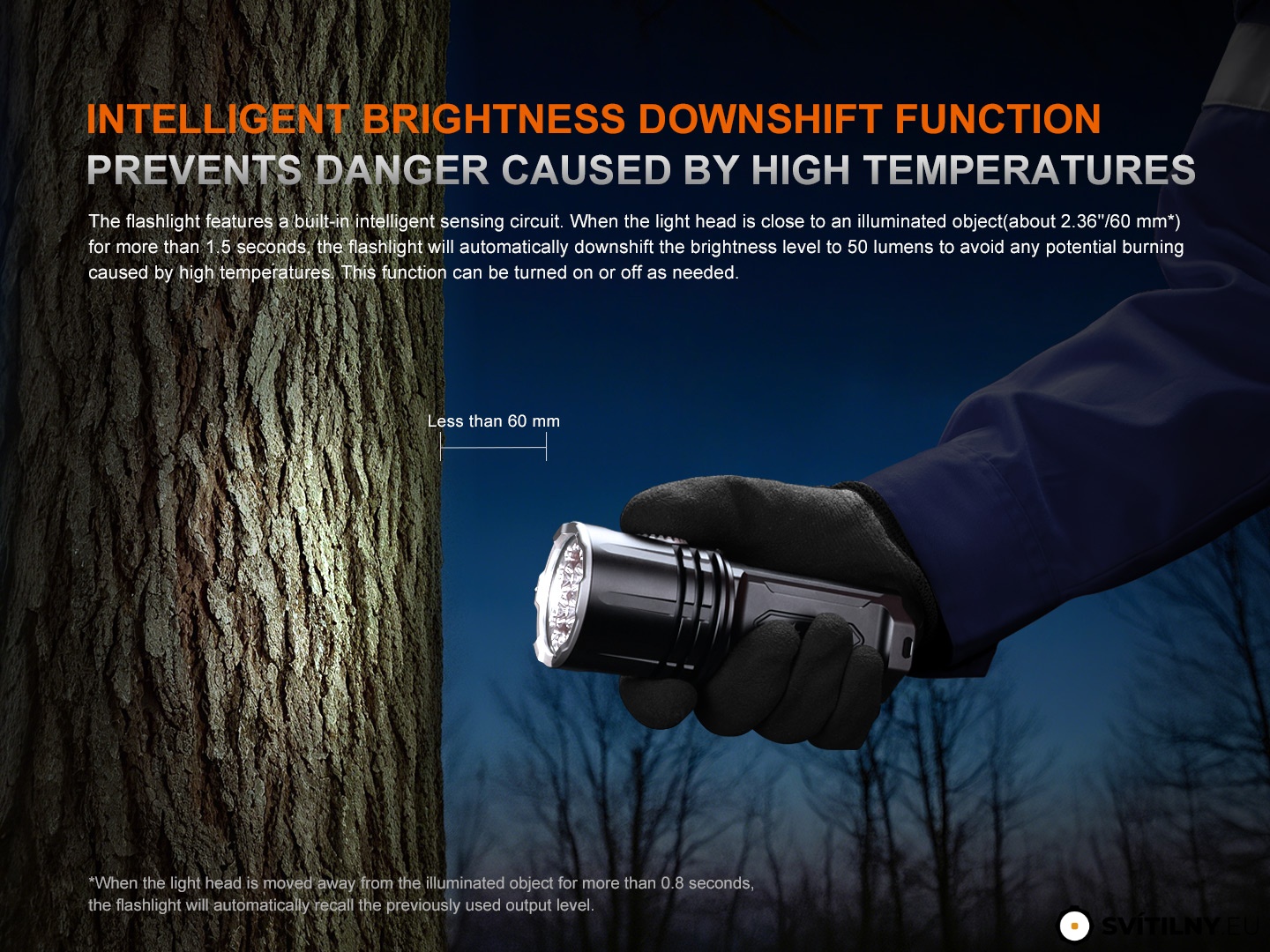Inteligentní senzor přiblížení - Svítilna má vestavěný bezpečnostní obvod. Když se reflektor přiblíží k osvětlovanému objektu na méně než 6 cm na více než 1,5 vteřiny, tak automaticky sníží výkon na 50 lumenů, aby se zabránilo poškození objektu silným světlem a oslnění odraženým světlem. Po oddálení se automaticky obnoví původní výkon.