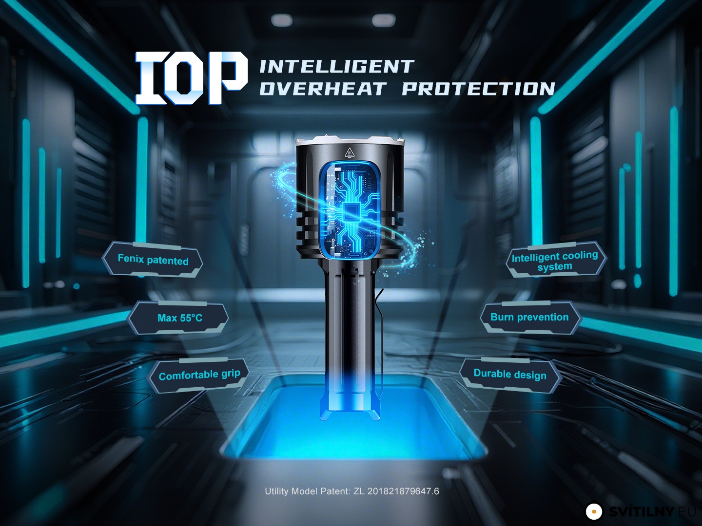 Inteligentní ochrana proti přehřátí - Při dlouhodobém používání svítilny na vysoké režimy výkonu se akumuluje velké množství tepla. Když svítilna dosáhne teploty 55 °C nebo vyšší, automaticky sníží výkon o několik lumenů, aby se teplota snížila. Když teplota klesne pod 55 °C, tak se výkon opět postupně zvýší.