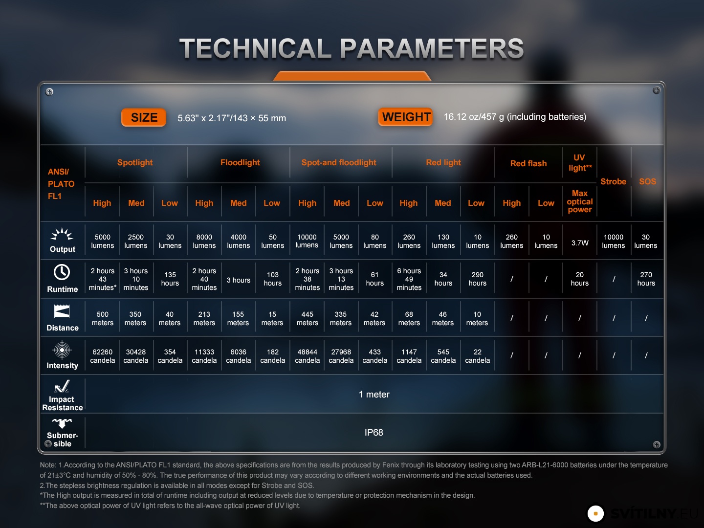 Všechny parametry svítilny (světelný tok, doba provozu na baterie, vodotěsnost, dosvit a nárazuvzdornost) jsou změřeny v souladu s normou ANSI/NEMA FL 1-2009.