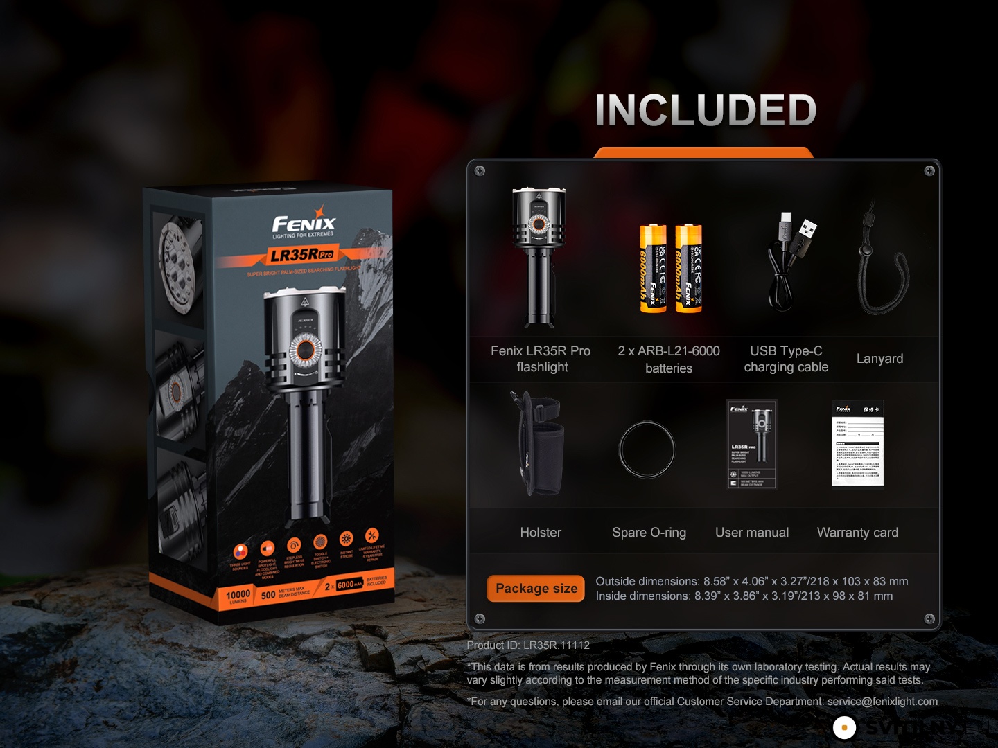 - Ke svítilně je přiloženo poutko na ruku, pouzdro, náhradní o-kroužek, 2x akumulátor Fenix ARB-L21-6000 a nabíjecí USB-C kabel.