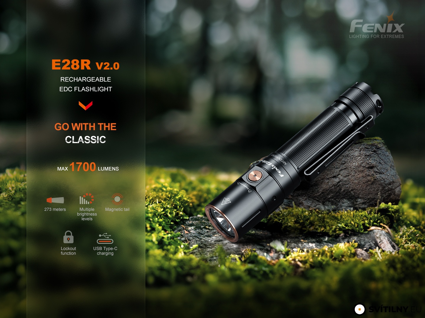 Nabíjecí kapesní svítilna Fenix E28R V2.0 nabízí světelný tok až 1700 lumenů (ANSI) a dosvit až 273 metrů. Patří mezi nejvýkonnější svítilny Fenix na jeden Li-ion akumulátor typu 18650, který se dobíjí přes USB-C port přímo na těle svítilny bez nutnosti jej vyjmout. V nouzi však lze svítilnu napájet i dvěma jednorázovými CR123A bateriemi. Proti první generaci má navíc praktickou magnetickou koncovku pro uchycení na cokoli železného. Svítilna E28R V2.0 disponuje sedmi různými režimy svícení, které umožní volit mezi vysokým výkonem a dlouhou výdrží (téměř 11 dní svícení v kuse), nechybí ani stroboskopické záblesky pro krizové situace a varovné světlo (Breathing light) v tlačítku, kde je umístěna i indikace stavu nabití baterie. Tato svítilna je ideálním světelným nástrojem s vynikajícím poměrem vysokého výkonu, kvality a ceny. Lze ji doporučit pro široké spektrum outdoorových, sportovních, pracovních i profesionálních aktivit.