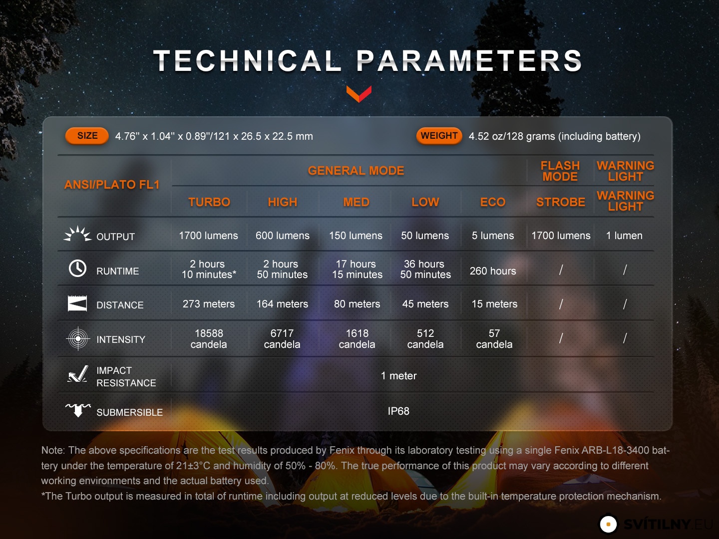 Všechny parametry svítilny (světelný tok, doba provozu na baterie, vodotěsnost, dosvit a nárazuvzdornost) jsou změřeny v souladu s normou ANSI/NEMA FL 1-2009.