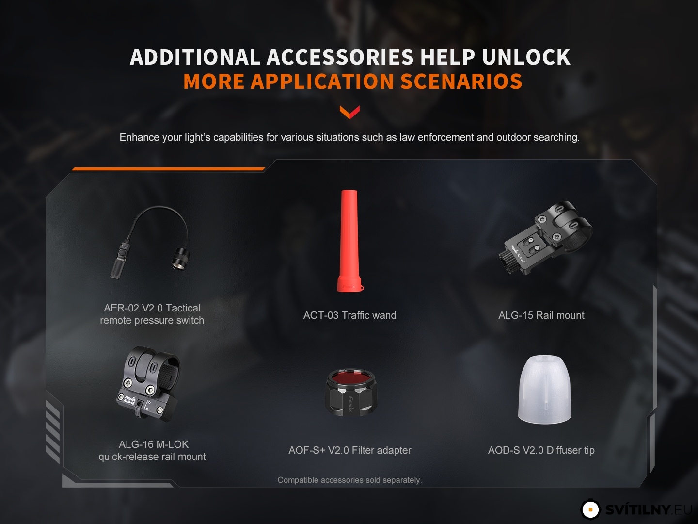 - Jako volitelné příslušenství lze například dokoupit: kabelový spínač AER-02, úchyt ALG-05 na vzdálený spínač, červený filtr AOF-S+ V2.0, difuzér AOD-S, silikonový dopravní kužel AOT-03, popruh Fenix ALD-05 pro použití svítilny na přilbě, montáž na zbraňovou lištu ALG-00, rychloupínací montáž na lištu ALG-15, držák na kolo, pouzdro ALP-10S, držák na cyklistickou přilbu BikeBlock, držák na kolo Fenix, případně kovová magnetická montáž na hlaveň, plastová magnetická montáž na hlaveň.