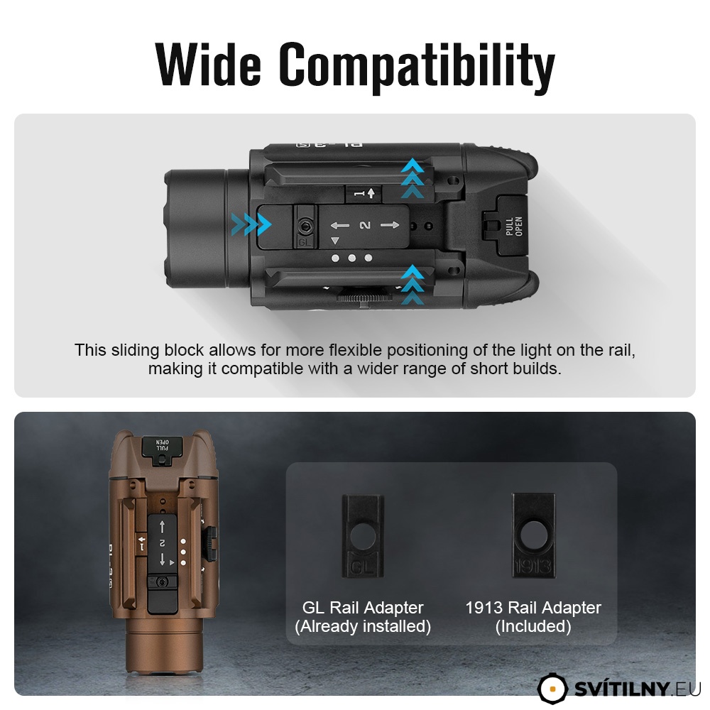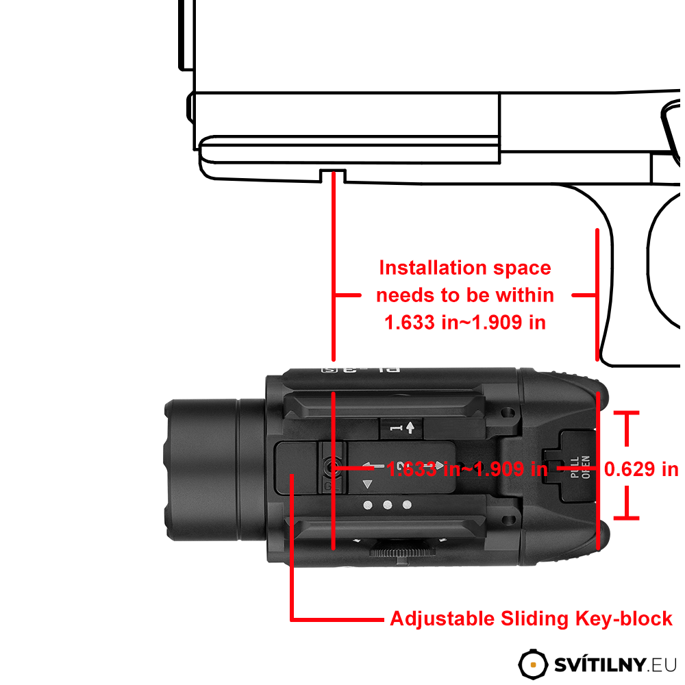Svítilna nemusí pasovat na zbraně z kategorie slimline, např. model Glock 30 (pro ověřené zbraně vizte tabulku v obrázcích).