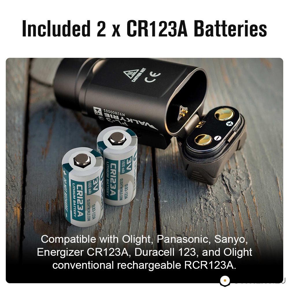 - Napájení 2x lithiová CR123A baterie (součástí balení), lze použít i nabíjecí li-ion RCR123A akumulátory.