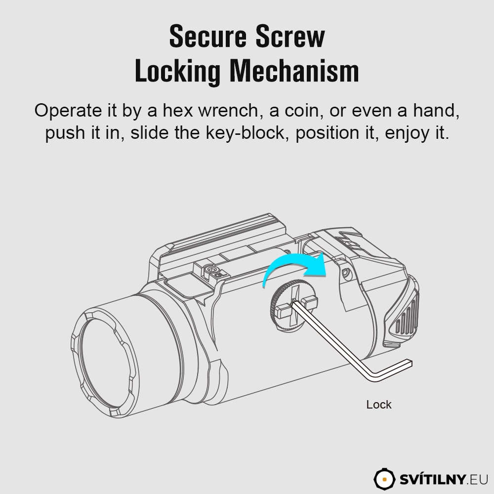 Montáž na pistoli - povolte šroub na boku, nasuňte svítilnu na zbraňovou lištu a zajistěte ji utažením šroubu. Můžete se si pomoci mincí nebo inbusem.