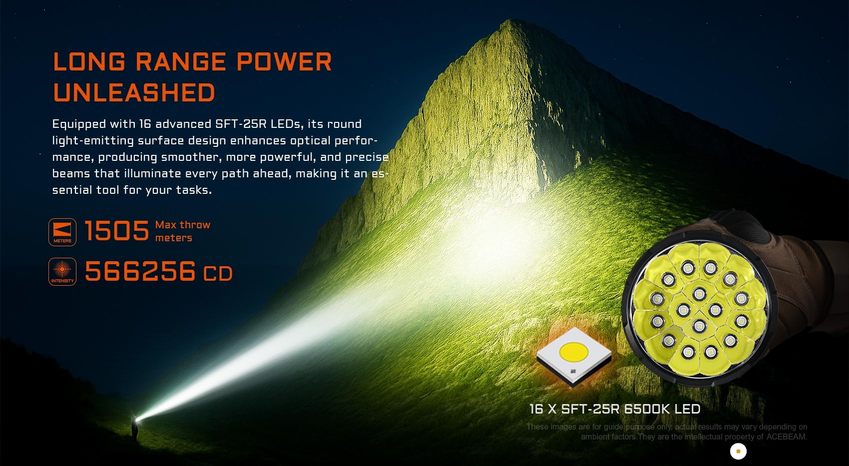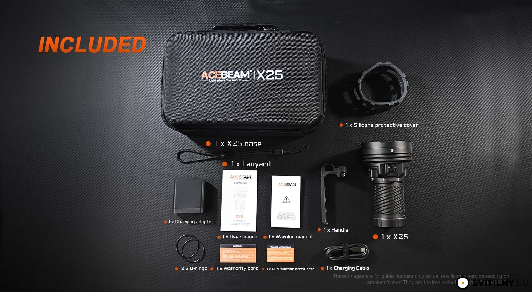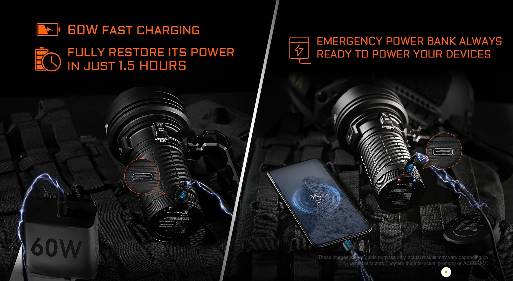 Nabíjecí svítilna AceBeam X25 nabízí extrémní výkon 22 000 lumenů a dosvit až 1505 metrů. Do těla s délkou necelých 16 centimetrů se výrobci podařilo umístit šestnáct špičkových LED SFT-25R, které zajišťují mimořádný dosvit pro jasnou identifikaci vzdálených cílů. V těle je zabudovaný vysokoproudový Li-ion akumulátor složený ze čtyř špičkových článků typu 21700 s celkovou kapacitou 61,2Wh (14,4V / 4250 mAh). Akumulátor se nabíjí přes USB-C konektor. Díky podpoře rychlonabíjecích protokolů lze akumulátor nabíjet výkonem až 60W. S přiloženým 60W USB adaptérem se tak nabije pouze za 1,5 hodiny. Svítilna je navíc vybavena i bočním RGB osvětlením, které je ideální například pro vytvoření atmosféry při kempování.