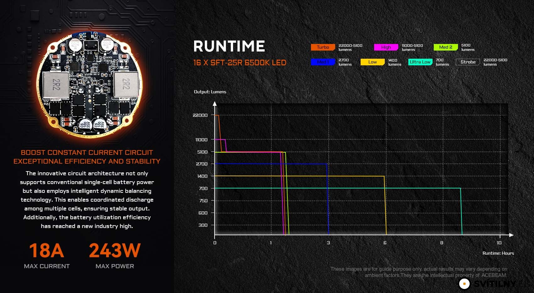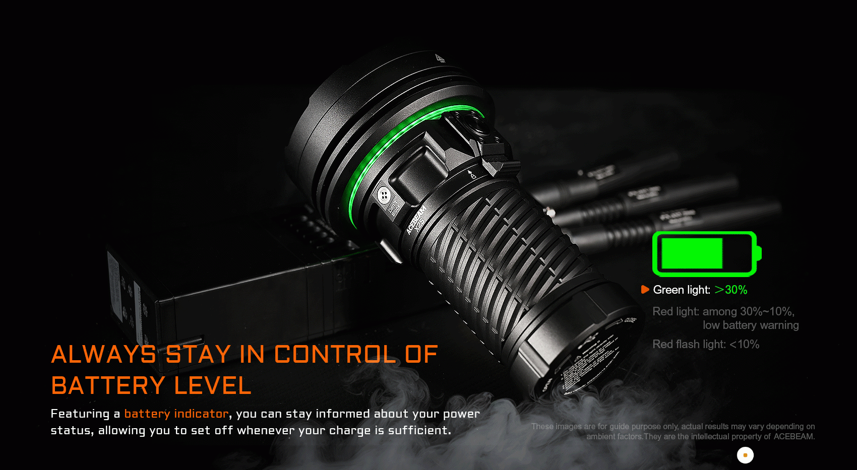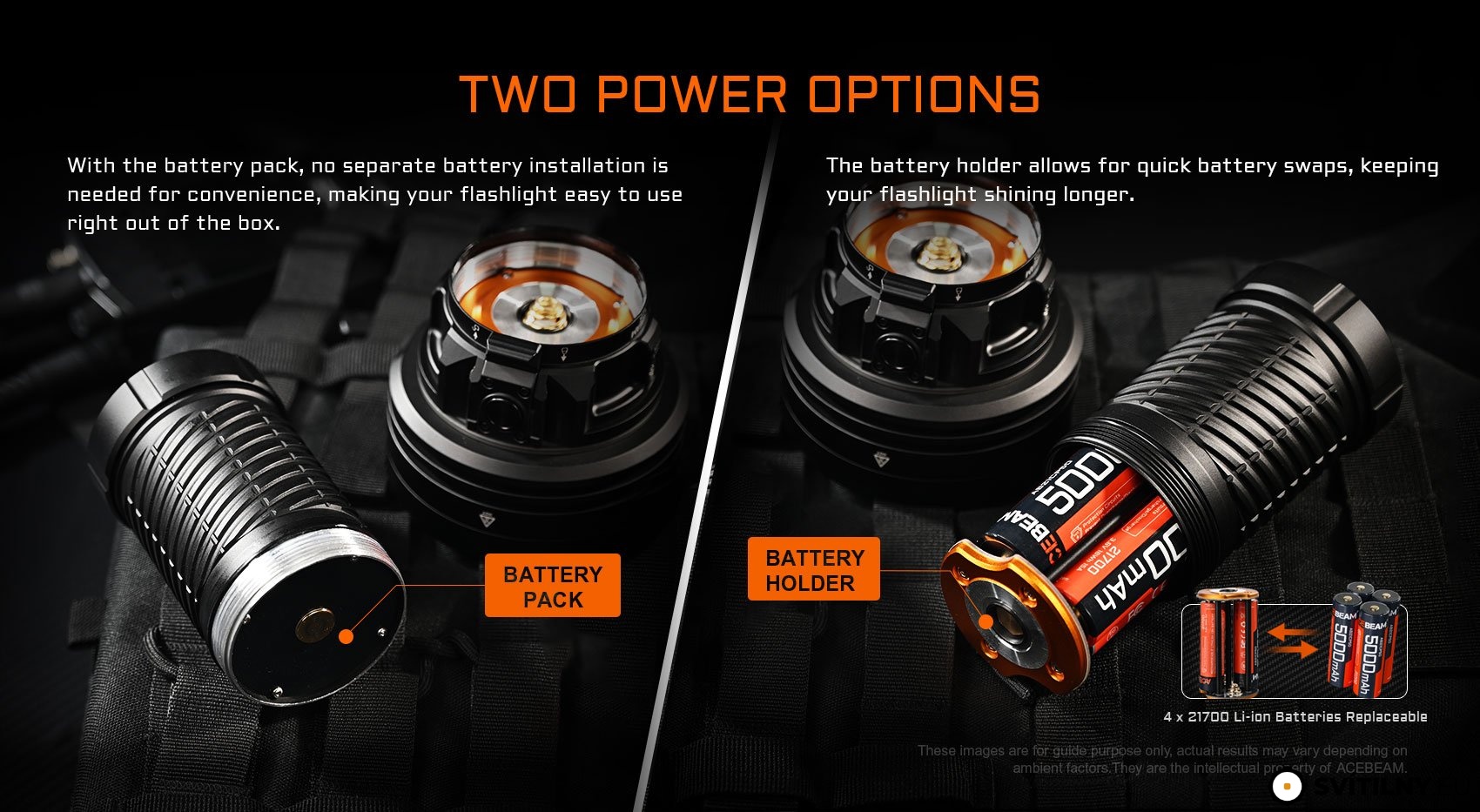 Nabíjecí svítilna AceBeam X25 nabízí extrémní výkon 22 000 lumenů a dosvit až 1505 metrů. Do těla s délkou necelých 16 centimetrů se výrobci podařilo umístit šestnáct špičkových LED SFT-25R, které zajišťují mimořádný dosvit pro jasnou identifikaci vzdálených cílů. V těle je zabudovaný vysokoproudový Li-ion akumulátor složený ze čtyř špičkových článků typu 21700 s celkovou kapacitou 61,2Wh (14,4V / 4250 mAh). Akumulátor se nabíjí přes USB-C konektor. Díky podpoře rychlonabíjecích protokolů lze akumulátor nabíjet výkonem až 60W. S přiloženým 60W USB adaptérem se tak nabije pouze za 1,5 hodiny. Svítilna je navíc vybavena i bočním RGB osvětlením, které je ideální například pro vytvoření atmosféry při kempování.