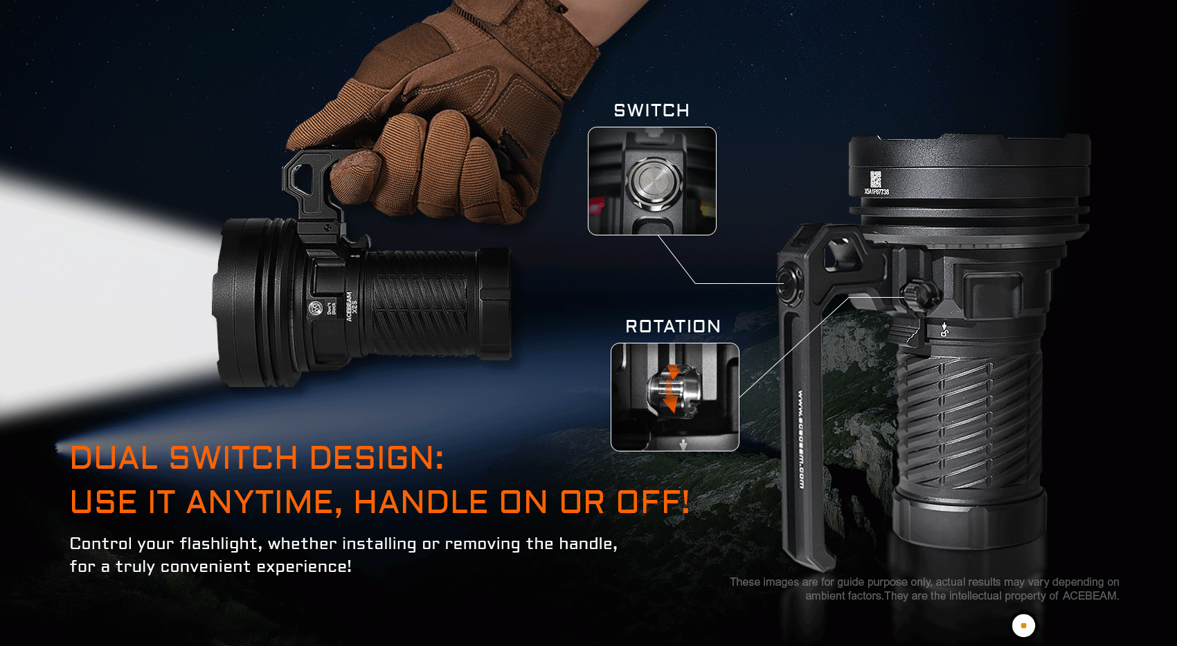Svítilna je vybavena duálním ovládáním - jedním tlačítkem na odnímatelném madle a druhým přímo na těle svítilny. To umožňuje plnou kontrolu a pohodlné používání jak s nasazeným madlem, tak i bez něj. Proti nechtěnému zapnutí při skladování a přepravě je svítilna vybavena patentovaným mechanickým zámkem, který zaručuje bezpečí a spolehlivost.