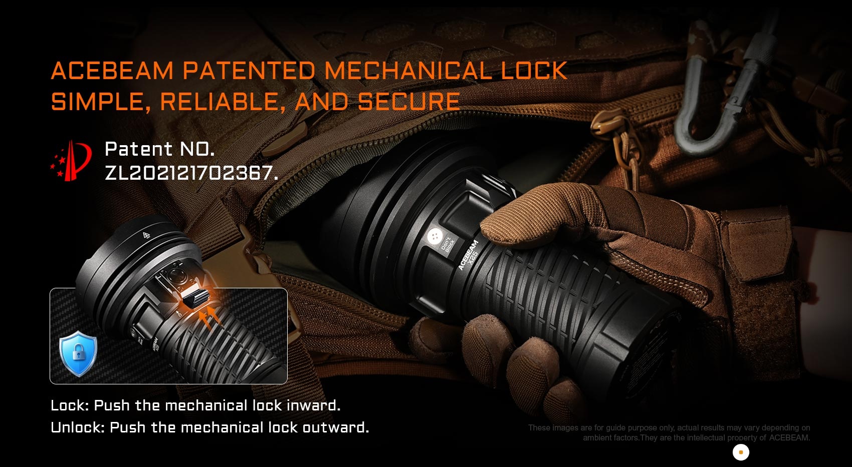 - Patentovaný mechanický zámek proti nechtěnému zapnutí svítilny.