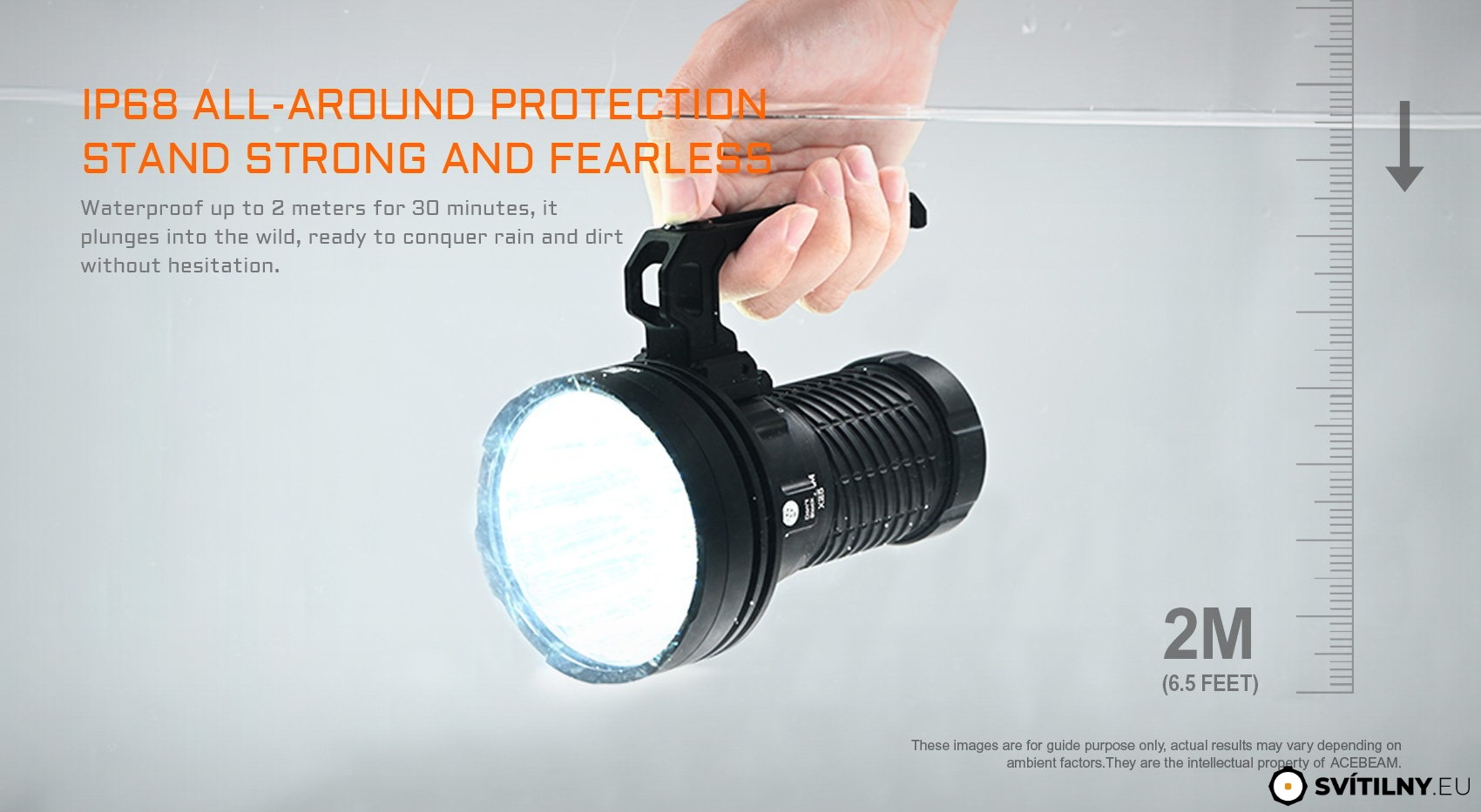 - Svítilna je vodotěsná a prachotěsná dle standardu IP68 (testováno ponorem do hloubky 2 metrů).